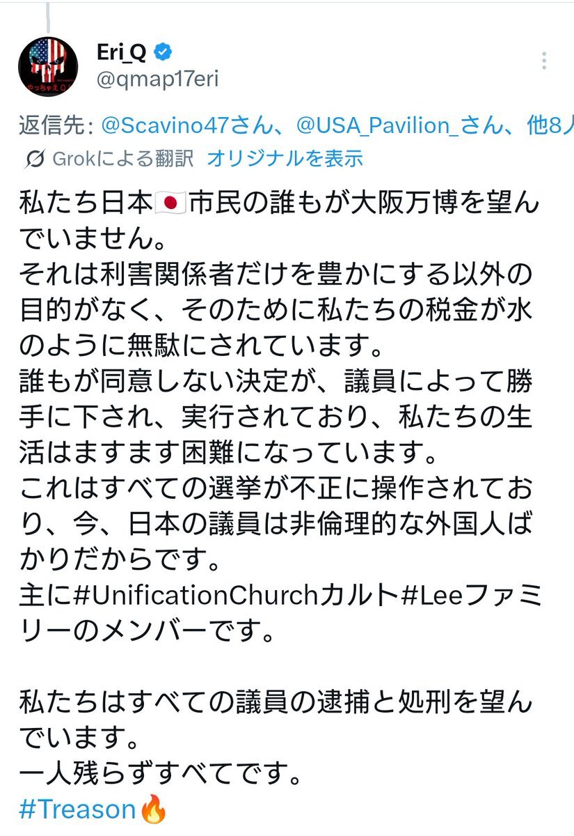 私たちの生活はますます困難になっています。 これはすべての選挙が不正に操作されており、今、日本の議員は非倫理的な外国人ばかりだからです。 主に #統一教会 カルト #李 一族のメンバーです。 私たちはすべての議員の逮捕と処刑を望んでいます。 一人残らずすべてです。 #Treason🔥 pic.x.com/OhY1ZoTV13 x.com/qmap17eri/stat…