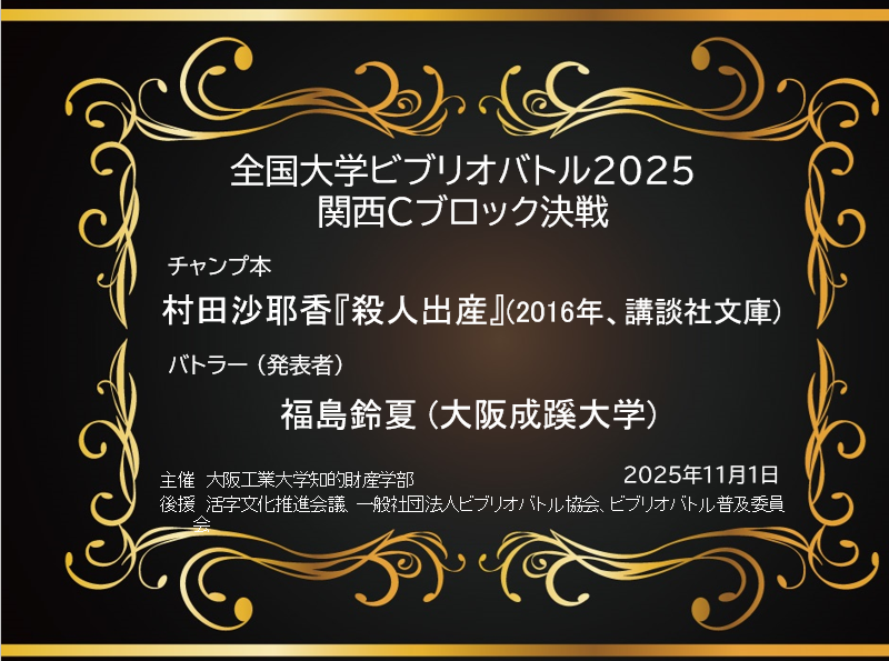 #全国大学ビブリオバトル2025 関西Cブロック決戦 チャンプ本は、#村田沙耶香『#殺人出産』 バトラーは、福島鈴夏さん(大阪成蹊大学) でした。 本戦は11/23(日祝) #ながさきピース文化祭 で開催。 本戦の観覧お申込は👇 zenkoku.bibliobattle.jp #bibliobattle #全国大学ビブリオバトル (水) pic.x.com/hvwe1OHgH0