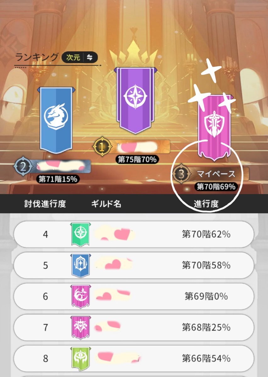 erver: 蒼風の烈域 Guild: マイペース ボスの反射攻撃が非常に痛い為、回復出来る方が多いうちは、声掛けにより回復スキルを多めに入れて臨みました。 その結果、今日だけで順位を二つ上げ、暫定3位まで上昇致しました ╰(*´︶`*)╯♡ #杖剣マイペースギルド討伐 #杖と剣の伝説 #杖剣 #tsueken pic.x.com/T2Jkq2LixW