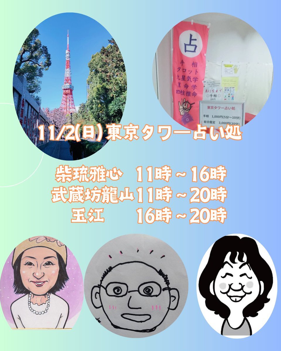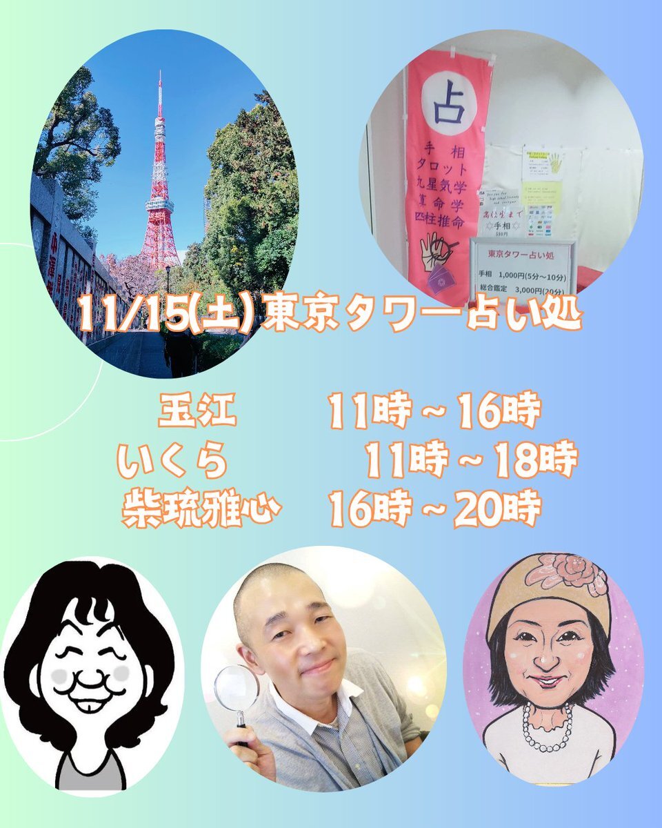 本日の東京タワー占い処担当 ⭐️柴琉雅心  @sairyumasane 手相 イーチンタロット 算命学 ⭐玉江  @tamaemotooka 手相 人相 タロット 九星 ⭐武蔵坊龍山 手相 タロット #東京タワー #東京タワー占い処 #占い #手相 #人相 #イーチンタロット #算命学 #タロット #九星 #気学 pic.x.com/8KXthlP9Ei