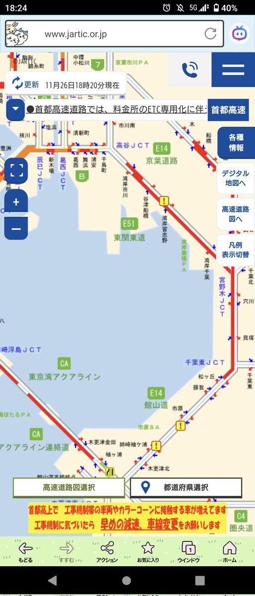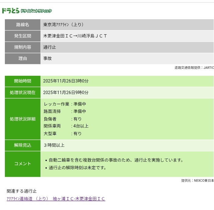 【通行止め】東京湾アクアライン上り線 事故により 袖ヶ浦IC→川崎浮島JCT間で通行止め。 2025年11月26日 午前10時05分現在 なお、館山*京葉道「市原IC→穴川IC 16キロ」「宮野木JCT→船橋IC 14キロ」「湾岸千葉→10キロ渋滞」 #東関道 #渋滞情報 #千葉県 #通行止め #東京湾アクアライン