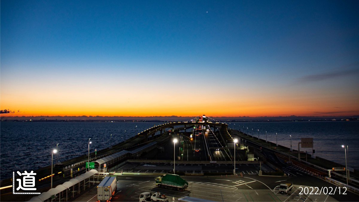 房総半島に向かう #東京湾アクアライン 海ほたるPAでの黎明。アクアブリッジ上方に明けの明星も輝く。1997年12月に開通。神奈川県川崎市側は東京湾の大型船舶と羽田空港への旅客機の航行を考えて約10kmのシールドトンネル、#海ほたる を挟んで橋梁約5kmで千葉県木更津市を繋ぐ #道 #橋