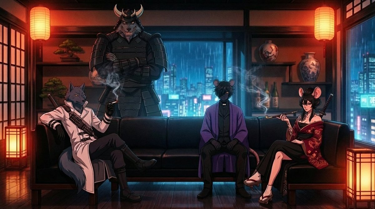 【汎用的キャラ集合動画】 1. オリキャラ4体のキャラシートから、NBPにて部屋、ソファを指定。 2. さらに演出として、照明、煙、煙草を段階的にNBPにて追加する。 3. Sora2にて動画化する。 注意点: 4人をSora2のみでしっかり話させよう安定性が下がる印象 #nanobananapro #sora2