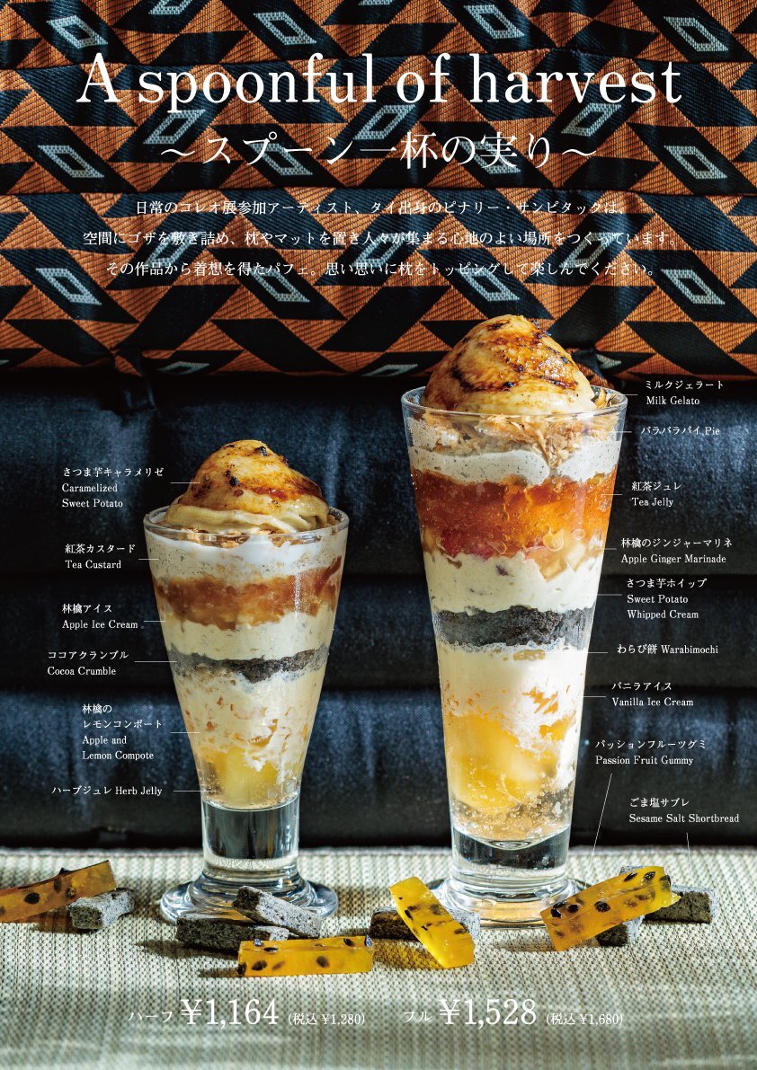 #東京都現代美術館 で開催中の『開館30周年記念展 日常のコレオ』出展作家のピナリー・サンピタックとのコラボパフェがレストラン「100本のスプーン」に登場!人々が集まる心地良い場所を作るピナリーの作品から着想を得たパフェです。 展覧会とあわせてぜひご賞味ください🥄 mot-art-museum.jp/guide/shop/ pic.x.com/gswTZDdnwL