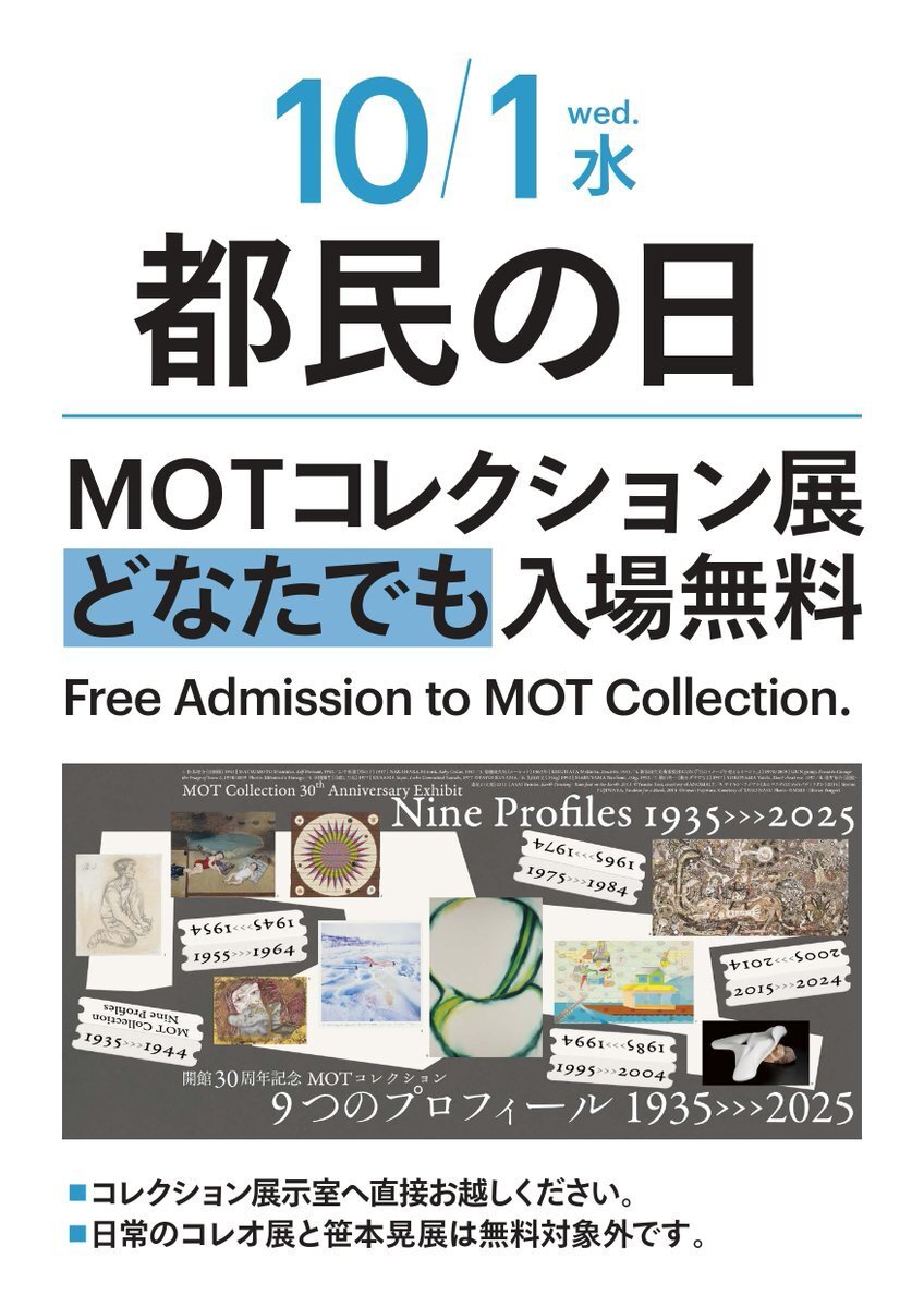 10/1(水) は都民の日! #東京都現代美術館 では、「開館30周年記念 MOTコレクション 9つのプロフィール 1935→2025」を無料でご覧いただけます。その他、無料で利用・入場できる都立の施設や鑑賞できる展覧会など詳細は⇒metro.tokyo.lg.jp/information/pr… pic.x.com/KDXl43cVoP