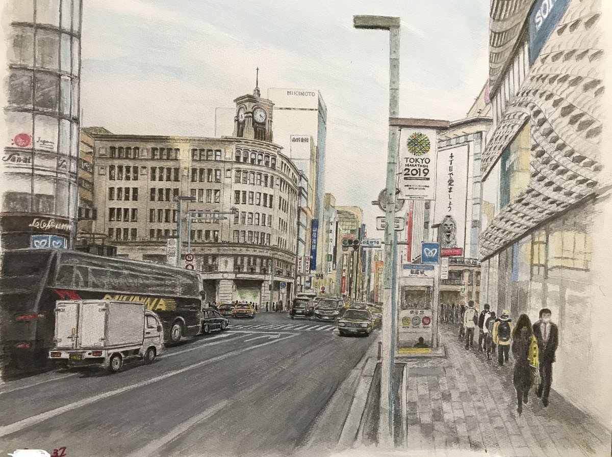 【再投稿】【水彩画37作目】銀座4丁目交差点 変わらぬ街並みと光を描いた一枚。 和光・三越・銀座プレイス…東京の記憶が息づく風景です。 🌐makuro7.com/%e9%8a%80%e5%b…にて作品公開中 #銀座4丁目 #水彩画 #東京風景 #銀座スケッチ #Makuro7 😄生活を向上し素敵な一日を#水彩画#アート好き