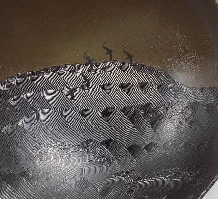 / 📢#是真展 本日16時迄開室❗️ 道に迷ったらお電話を🚶 #東京黎明アートルーム 🚗駐車場あり 🔎単眼鏡推奨 \ 青海波千鳥蒔絵三組盃 是真作 見込みに青海波塗を施し、高上げした上に黒漆で群れ千鳥を描く背景は青銅塗 裏面各盃左下に「是真」「是真冩」「以青海勘七意是真」の蒔絵銘 (つづく👇) pic.x.com/JFlzpMvfRo