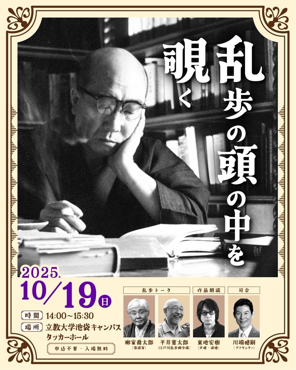 📢立教大学ホームカミングデーで特別企画「乱歩の頭の中を覗く」開催! 🔶10月19日(日)14:00-15:30 🔶池袋キャンパス タッカーホール 【第一部】乱歩トーク:乱歩令孫 #平井憲太郎 さん×落語家 #柳家喬太郎 師匠 【第二部】「人間椅子」朗読:声優 #東地宏樹 さん MC:アナウンサー #川端健嗣 さん pic.x.com/UVym9mYNqE