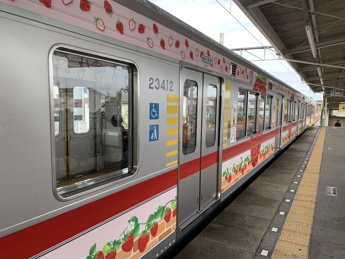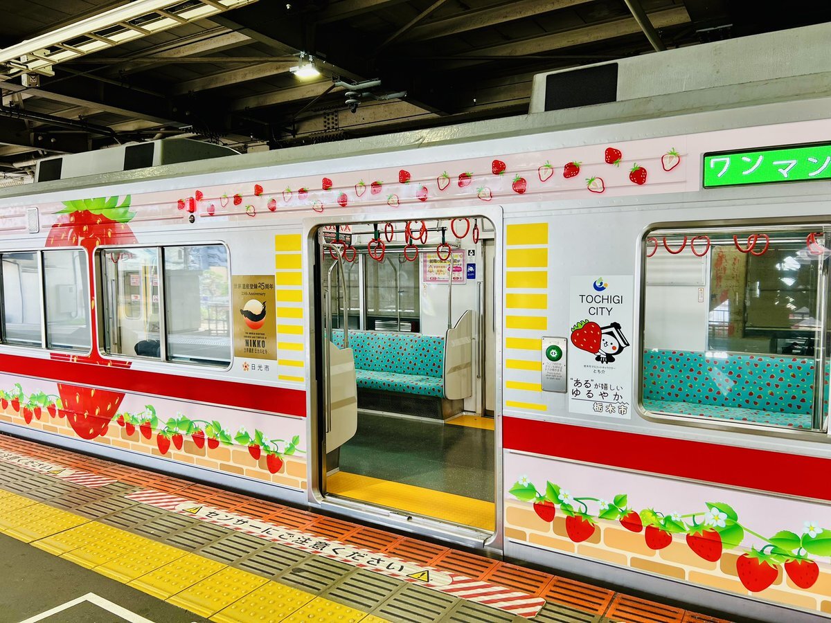 いちご電車🍓🚃知ってる⁉️ 車内はシートも吊り革もいちご🍓柄 外もいちご🍓だらけなのよ🥰 #いちご電車🍓🚃 #いちご王国ライン #東武宇都宮線 #かなりピンクだけど新生姜じゃない😆 pic.x.com/XAJ43P82dn