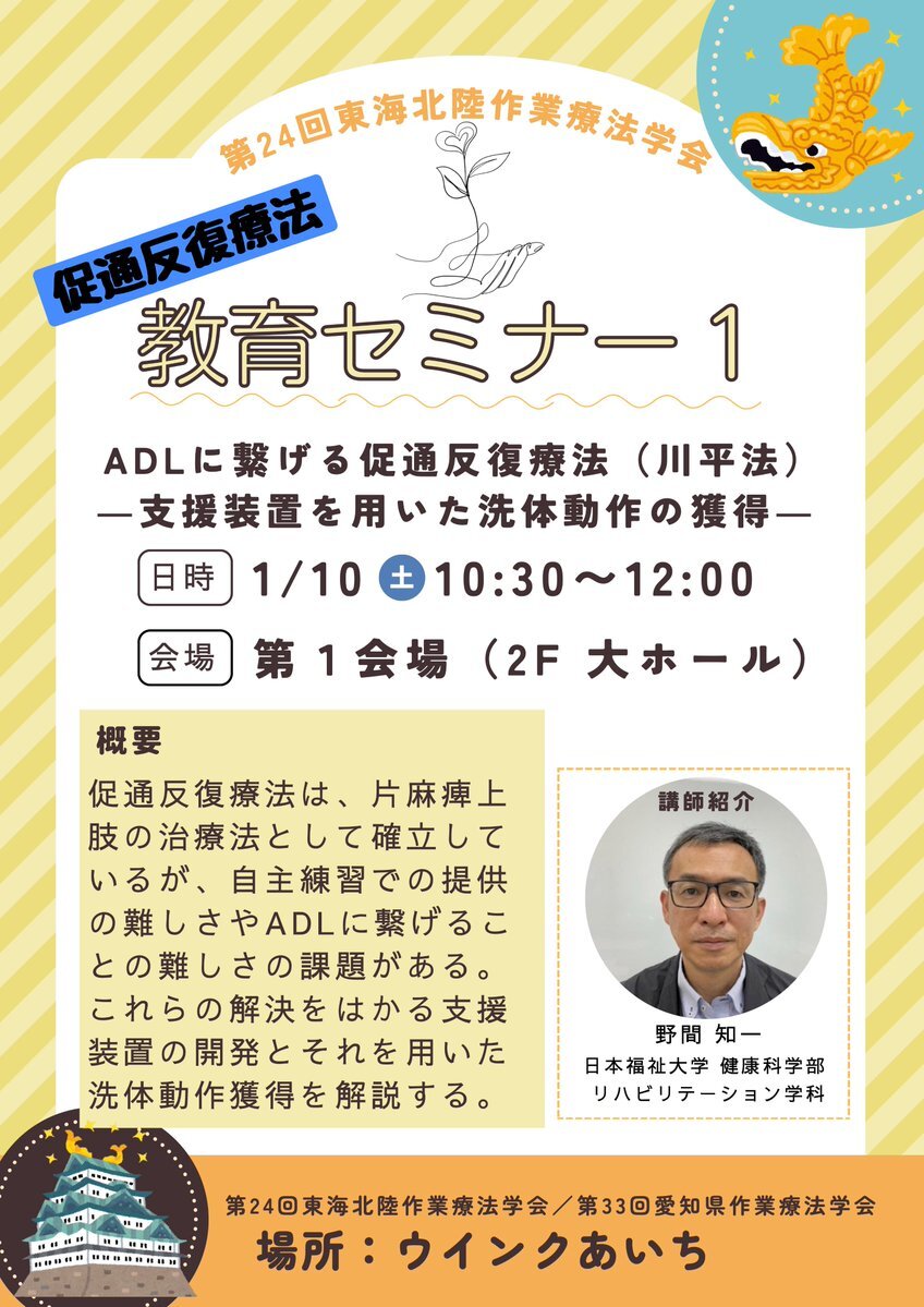 【講演・セミナー情報】その4 1/10(土) 教育セミナー1 日本福祉大学の 野間 知一 先生 をお招きし、ADLに繋げる促通反復療法についてご講演いただきます! #東海北陸作業療法学会 #愛知作業療法学会 #作業療法士 #リハビリ #脳卒中 #上肢機能 #促通反復療法 #川平法 #ADL #学会 #tkhrot24 pic.x.com/9xb4uCxjaY