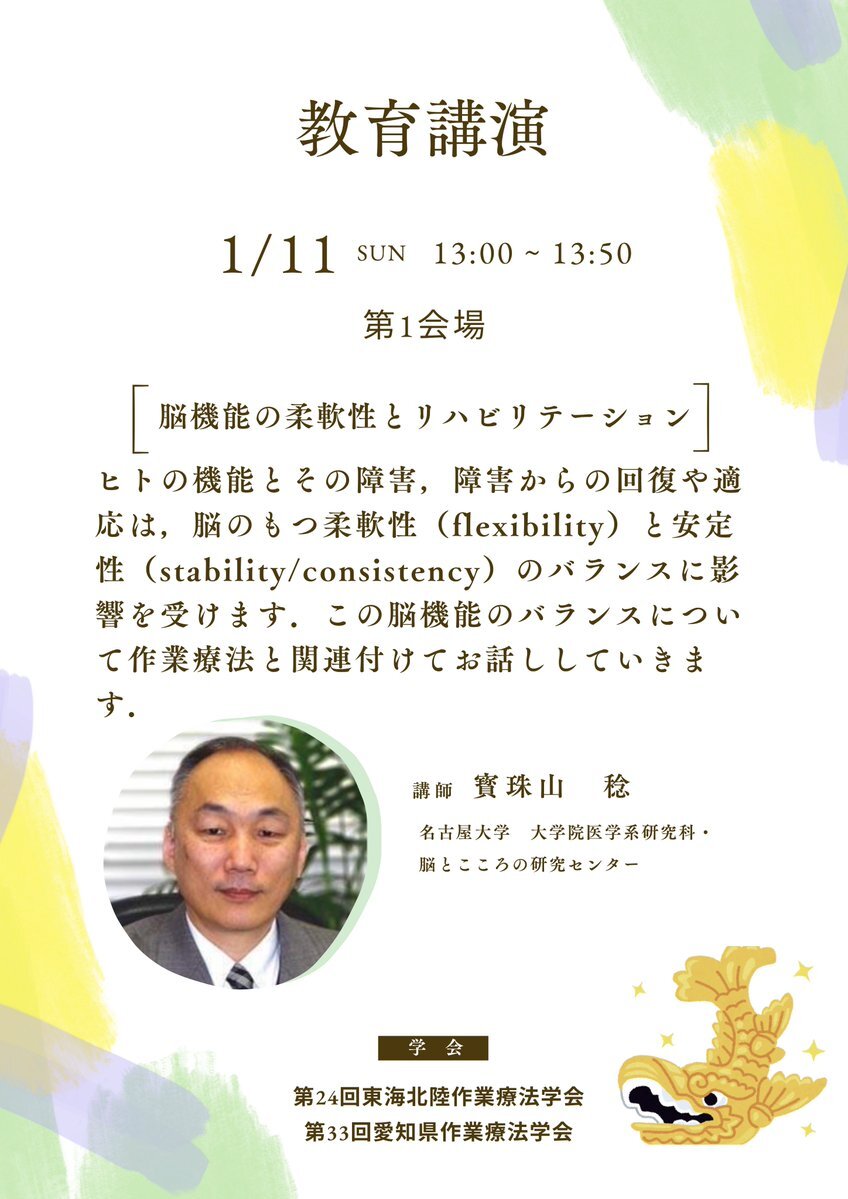 【講演・セミナー情報】その3 1/11(日) 教育講演には 名古屋大学大学院の 寳珠山 稔 先生 をお招きし、脳機能と作業療法についてご講演いただきます! #東海北陸作業療法学会 #愛知OT学会 #作業療法 #作業療法士 #リハビリ # #脳機能 #高次脳機能 #認知機能 #OT #tkhrot24 pic.x.com/0g7rftKu07