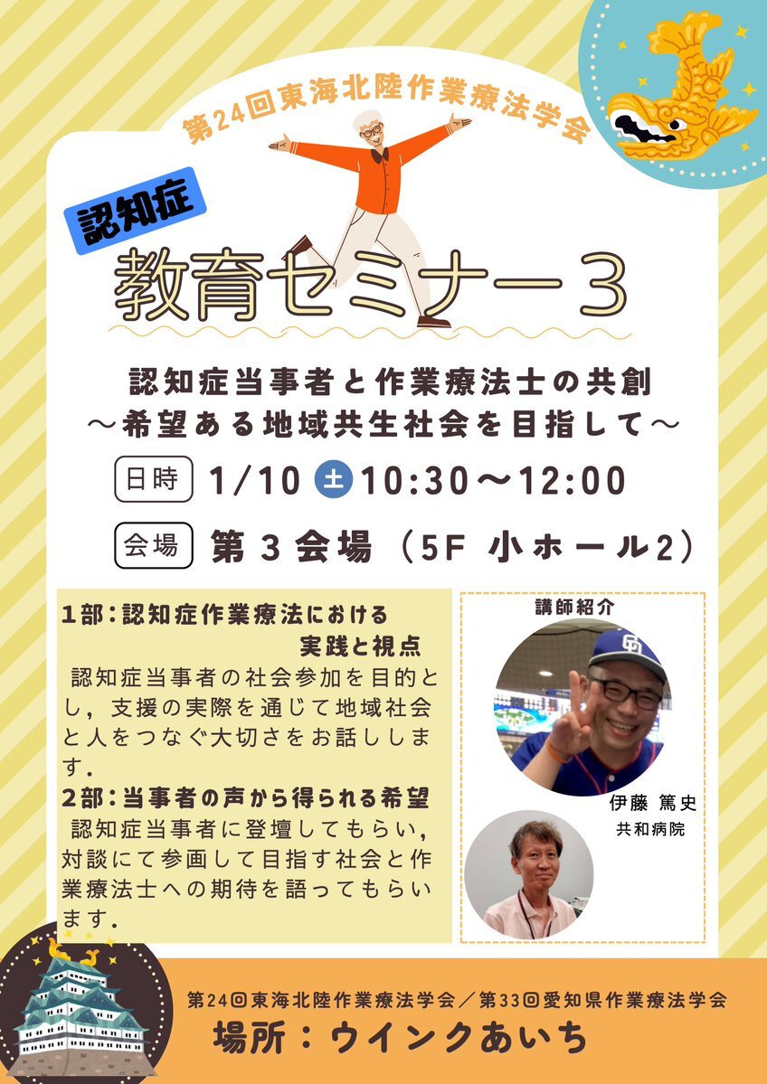 【講演・セミナー情報】その6 1/10 (土) 教育セミナー3 共和病院の 伊藤 篤史 先生 をお招きし「認知症当事者と作業療法士の共創~希望ある地域共生社会を目指して~」について ご講演いただきます! #東海北陸作業療法学会 #愛知作業療法学会 #作業療法士 #リハビリ #認知症 #学会 #tkhrot24 pic.x.com/Oy1uEezCnI