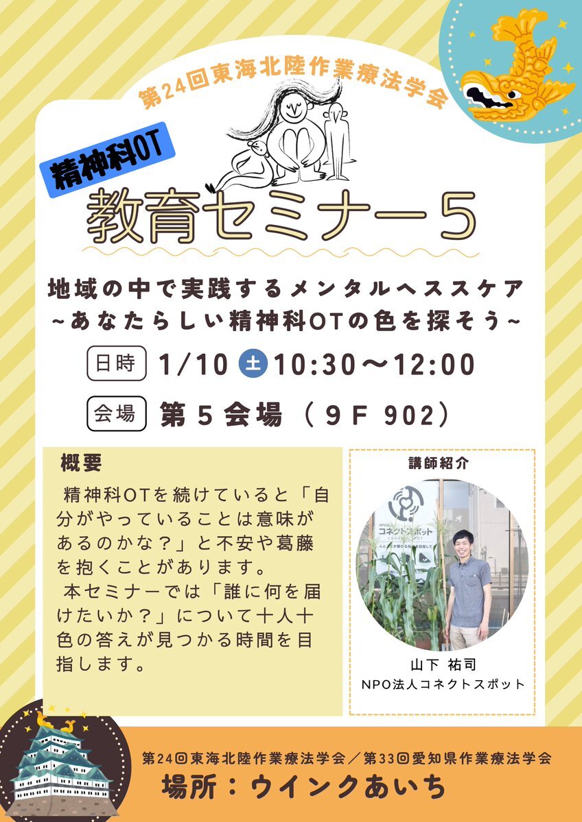 【講演・セミナー情報】その8 1/10 (土) 教育セミナー5 NPO法人コネクトスポットの 山下 祐司 先生 をお招きし「地域の中で実践するメンタルヘルスケア ~あなたらしい精神科OTの色を探そう~」をご講演いただきます! #東海北陸作業療法学会 #愛知作業療法学会 #作業療法 #精神OT #地域 #tkhrot24 pic.x.com/5pG8pgriiu