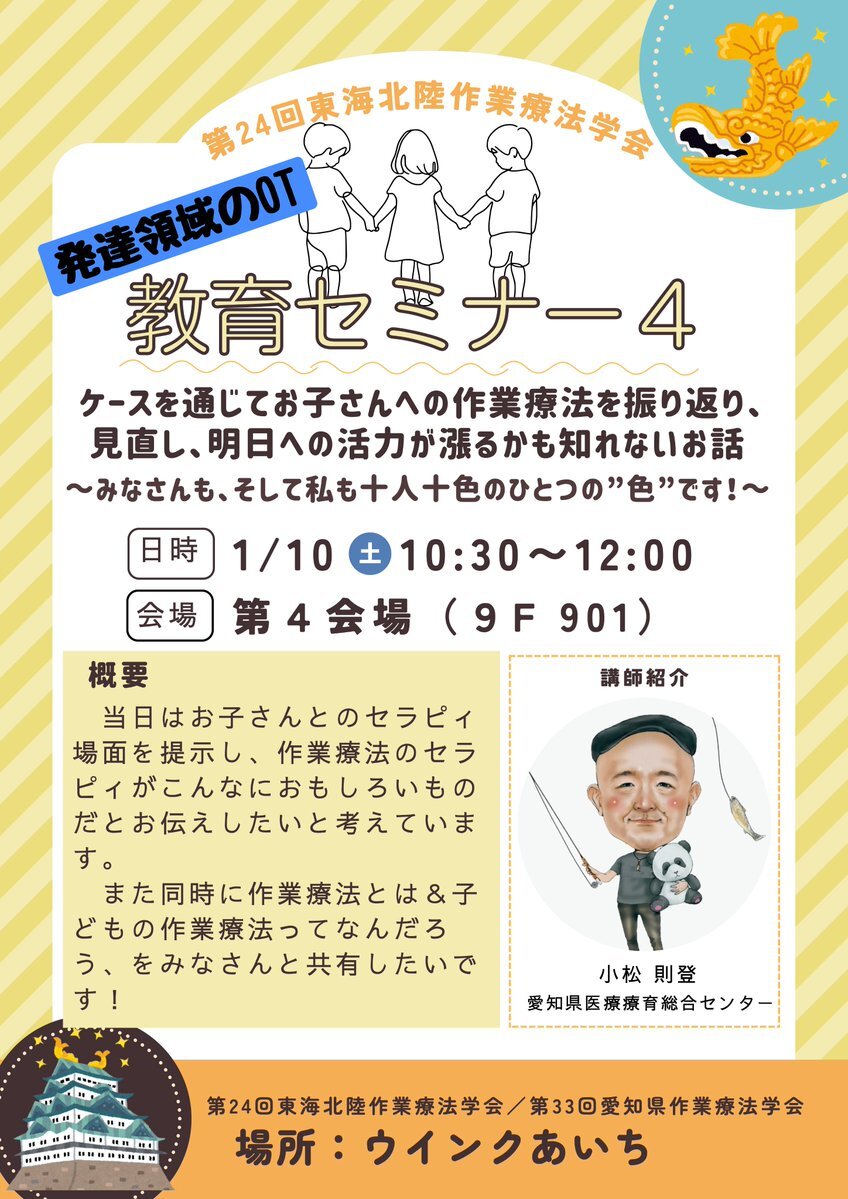 【講演・セミナー情報】その7 1/10 (土) 教育セミナー4 愛知県医療療育総合センターの 小松 則登 先生 をお招きし「発達領域の作業療法」について ご講演いただきます! #東海北陸作業療法学会 #愛知作業療法学会 #作業療法士 #リハビリ #発達 #発達領域OT #学会 #tkhrot24 pic.x.com/t5YQUL1dQr