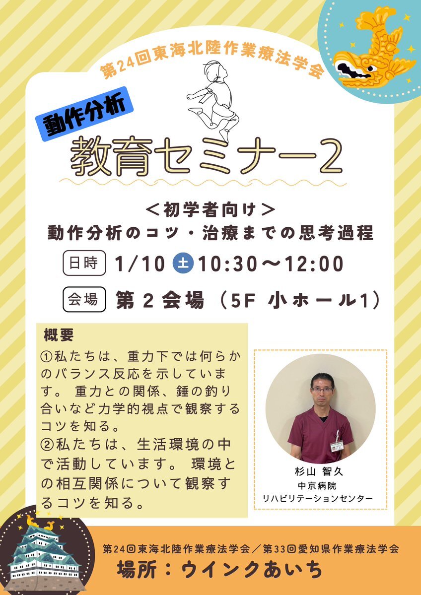 【講演・セミナー情報】その5 1/10 (土) 教育セミナー2 中京病院の 杉山 智久 先生 をお招きし「初学者向け 動作分析のコツ・治療までの思考過程」について ご講演いただきます! #東海北陸作業療法学会 #愛知作業療法学会 #作業療法士 #リハビリ #動作分析 #臨床思考過程 #ADL #学会 #tkhrot24 pic.x.com/oBXKUDbb14