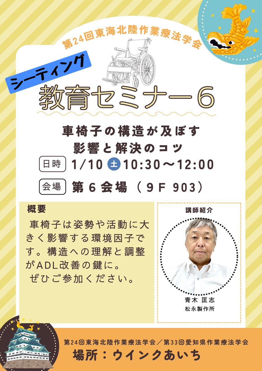 【講演・セミナー情報】その9 1/10 (土) 教育セミナー6 松永製作所の 青木 匡志 先生 をお招きし「車椅子の構造が及ぼす影響と解決のコツ」をご講演いただきます! #東海北陸作業療法学会 #愛知作業療法学会 #作業療法 #作業療法士 #車椅子 #シーティング #身体障害 #教育セミナー #学会 #tkhrot24 pic.x.com/NRi05HpZKT