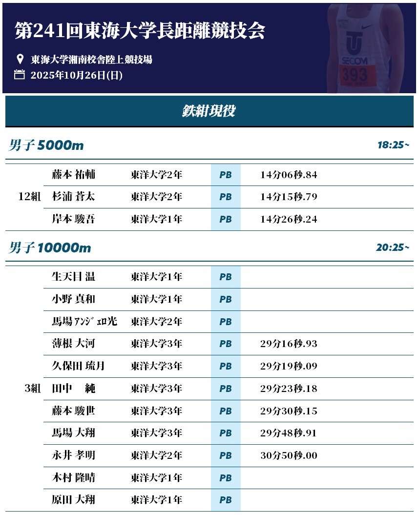 #東海大記録会 10/26 【鉄紺勢出場予定🏃♂️】 ★男子5000m 藤本祐輔(2) 14:06.84 杉浦蒼太(2) 14:15.79 岸本駿吾(1) 14:26.24 ★男子10000m 薄根大河(3) 29:16.93 久保田琉月(3) 29:19.09 田中純(3) 29:23.18 藤本駿世(3) 29:30.15 馬場大翔(3) 29:48.91 永井孝明(2) 30:50.00 馬場アンジェロ光(2) pic.x.com/yRX622i5KQ