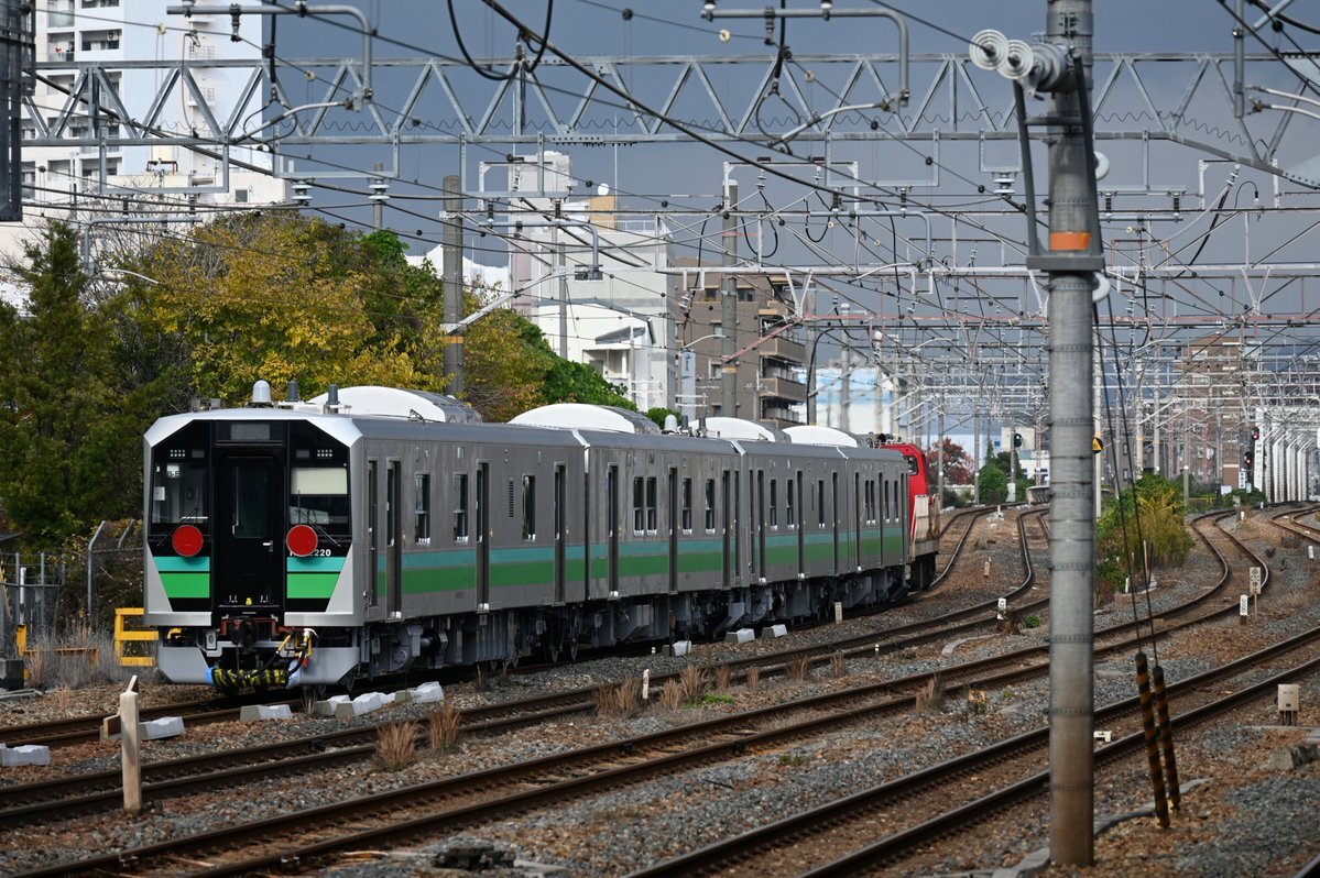 生憎の曇天の中、できたてほやほやのディーゼルハイブリット車が、東に向かって上っていきました。(2025.11.26撮影・東海道本線 東淀川駅) #東海道本線 #HB-E200 #甲種 pic.x.com/FmIfPtFyze