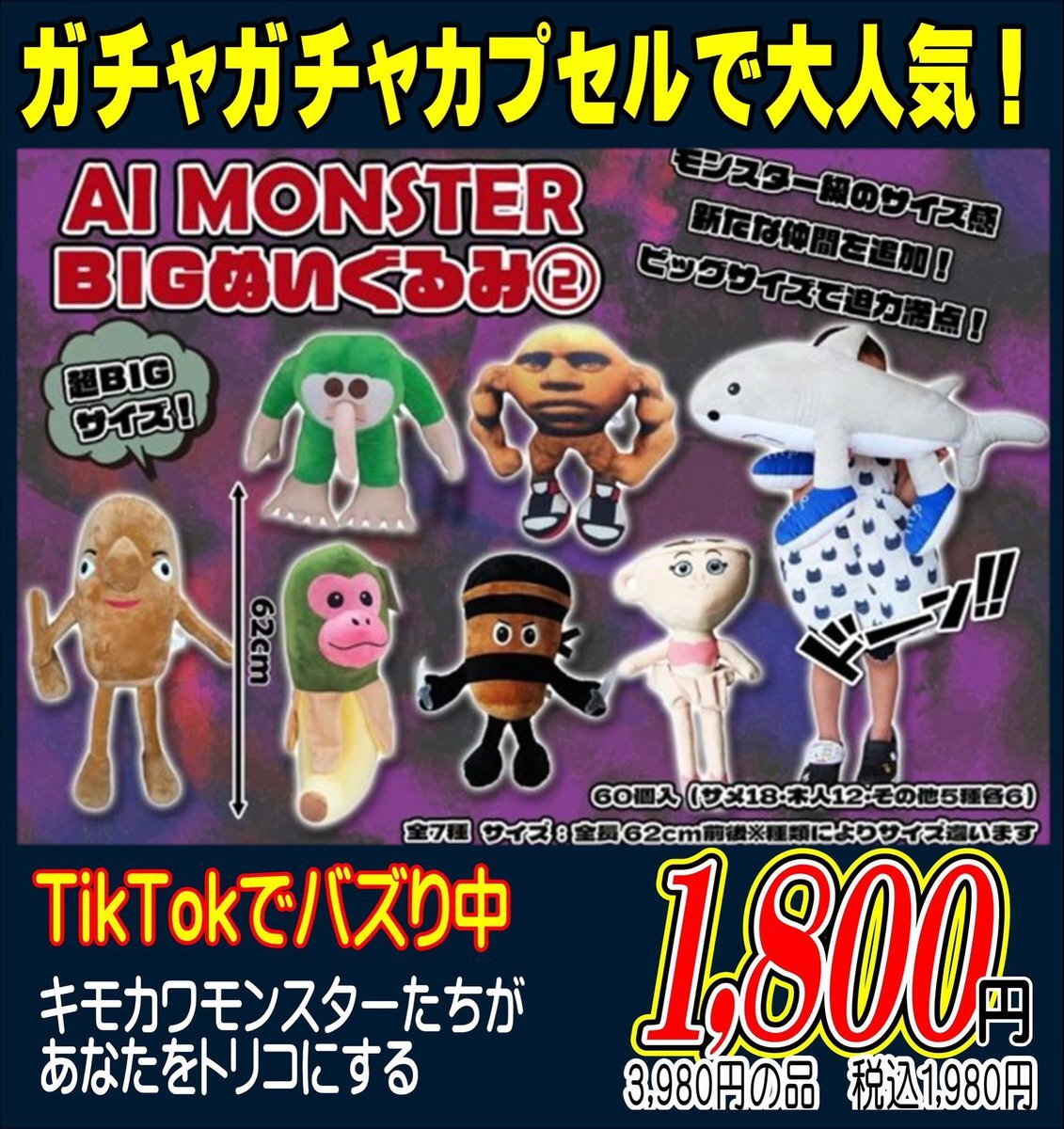 AI MONSTER BIGぬいぐるみ モンスター級のサイズ感新たな仲間を追加! ビッグサイズで迫力満点! 全長約62cm前後(種類によりサイズ違います) #aiモンスター #aimonster #ジムラッキー #上新庄 #東淀川区 #吹田市 #摂津市 #大阪市 #東淀川区南江口 #東淀川区小松 #東淀川区瑞光 pic.x.com/RZNWi8Zkwe