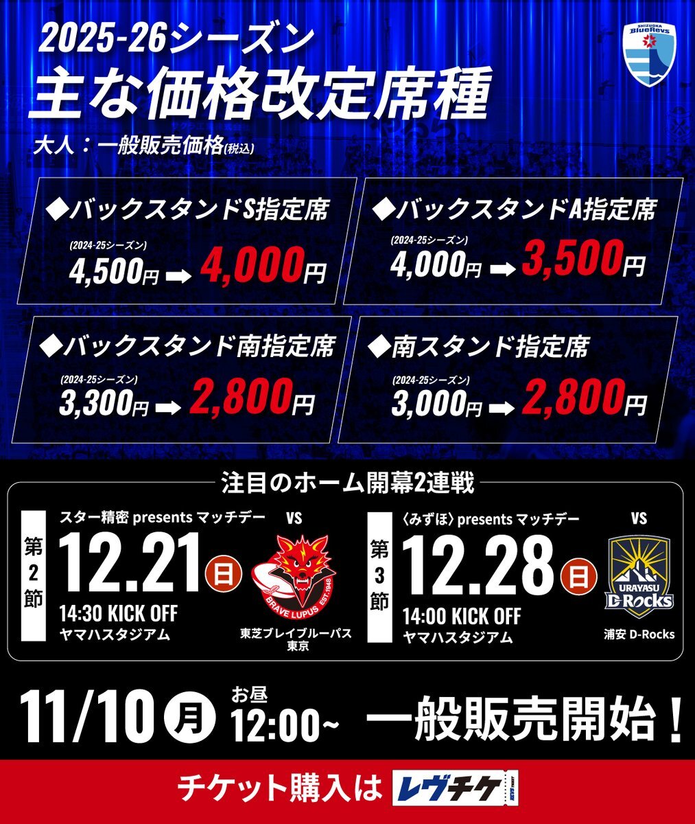 ホーム開幕2連戦は明日12時からチケット一般発売📌今季は一部座席のチケット価格を値下げしています↘️ 📅12/21(日) 14:30 スター精密 presents マッチデー 🆚 #東芝ブレイブルーパス東京 📅12/28(日) 14:00 〈みずほ〉 presents マッチデー 🆚浦安D-Rocks #drocks 👇試合情報 pic.x.com/Iy24CnOmHL