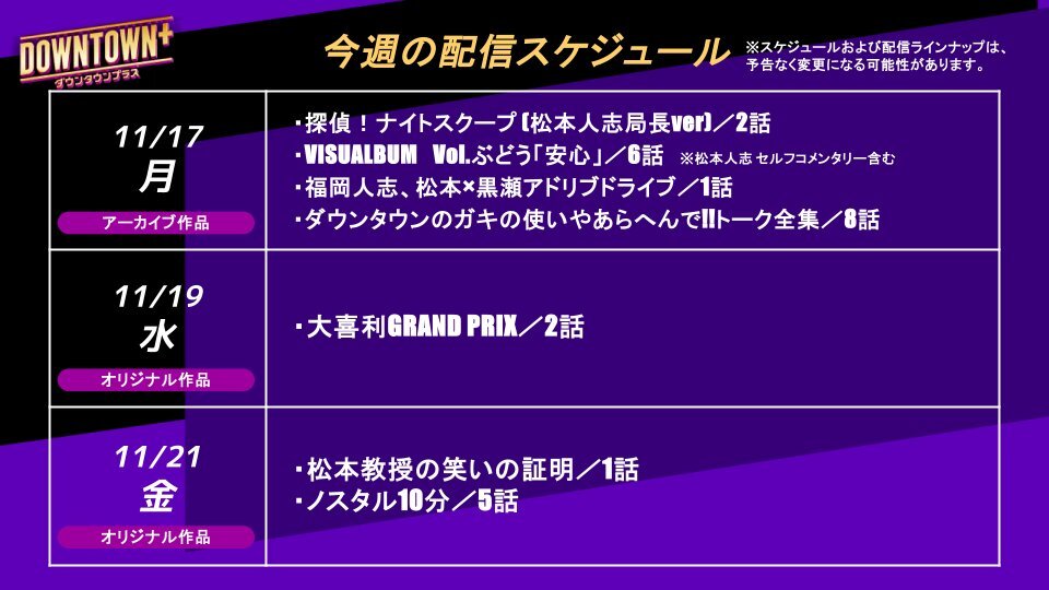 💎11/17週のオススメ番組 +─+─+─+─+─+ ◆月:アーカイブ作品 更新 ▫探偵!ナイトスクープ (松本人志局長ver)/2話 ▫VISUALBUM Vol.ぶどう「安心」/6話 ※松本人志 セルフコメンタリー含む ▫福岡人志、松本×黒瀬アドリブドライブ/1話