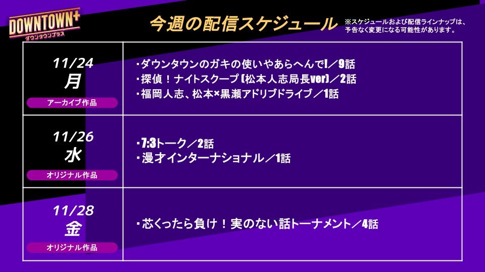 💎11/24週のオススメ番組 +─+─+─+─+─+ ◆月:アーカイブ作品 更新 ▫ダウンタウンのガキの使いやあらへんで!/9話 ▫探偵!ナイトスクープ (松本人志局長ver)/2話 ▫福岡人志、松本×黒瀬アドリブドライブ/1話 ◆水・金:オリジナル作品 更新 ▫7:3トーク/2話
