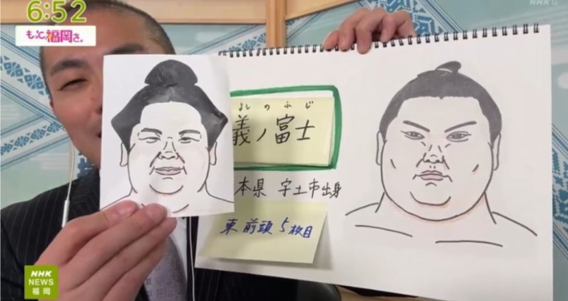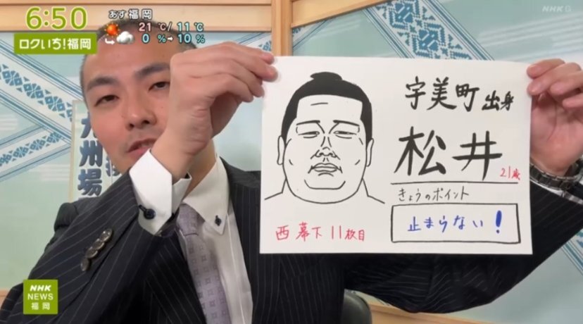 松井と、その松井が付け人を務める義ノ富士の取組 どちらもいい相撲だったよね それにしても相変わらず戸部アナの似顔絵がマジ上手 #ロクいち福岡 #松井 #義ノ富士 pic.x.com/l82qRQC1vu