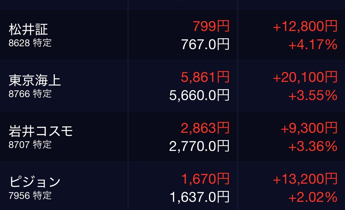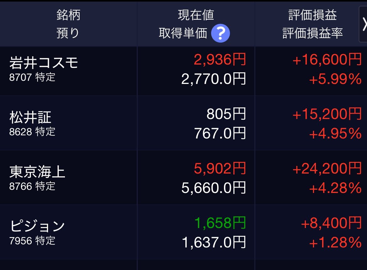 決算しくった銘柄たち 順調に伸びてます🥰 調子乗ると良いことないけど… (株って簡単) #ピジョン #松井証券 #岩井コスモ pic.x.com/H9h4yk076z x.com/seamanxinvesto…