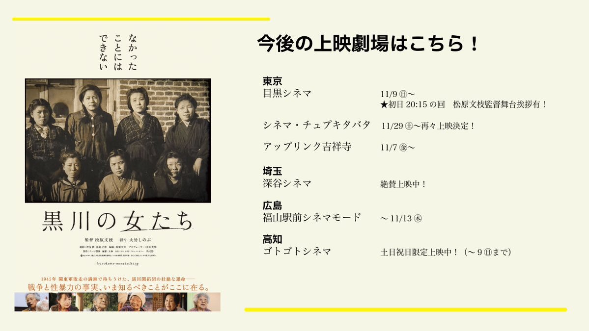 ━━━━━━━━ 『#黒川の女たち 』 今後の上映情報! ━━━━━━━━ 映画をご覧くださった方また、 気になっている方々からのリクエストの声もあり 都内上映まだまだ増えております🙏! 11/9(日)は #目黒シネマ にて 20:15の回上映後 #松原文枝 監督による 舞台挨拶も開催決定! ぜひ! pic.x.com/wgMq21v5dV