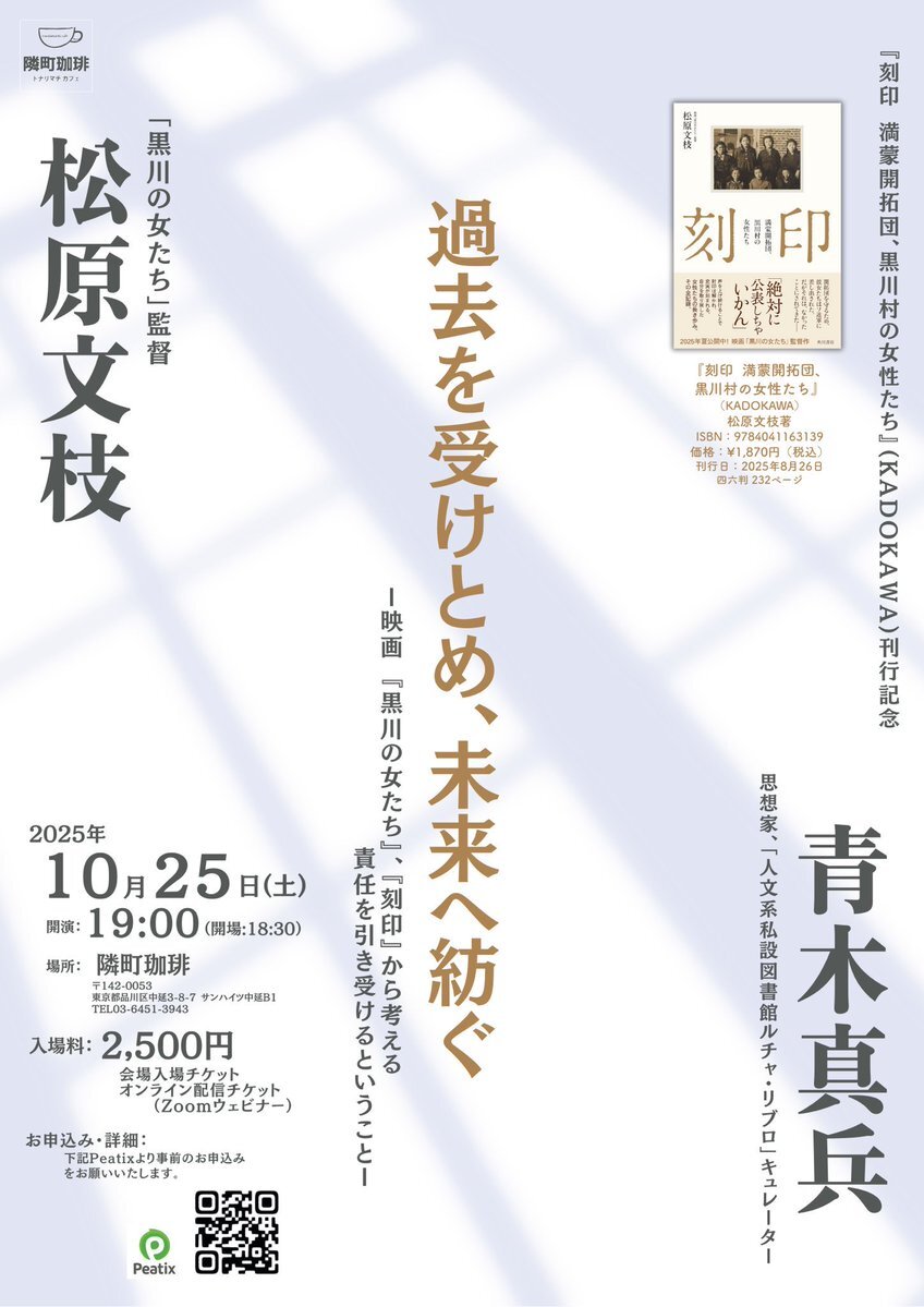 【土曜開催】 #松原文枝×#青木真兵「過去を受けとめ、未来へ紡ぐ」ー映画 『黒川の女たち』、『刻印』から考える責任を引き受けるということー10/26(土)19:00〜 @womenofkurokawa @kadokawa_PR 今週土曜です! pic.x.com/PmfmFRhvm7