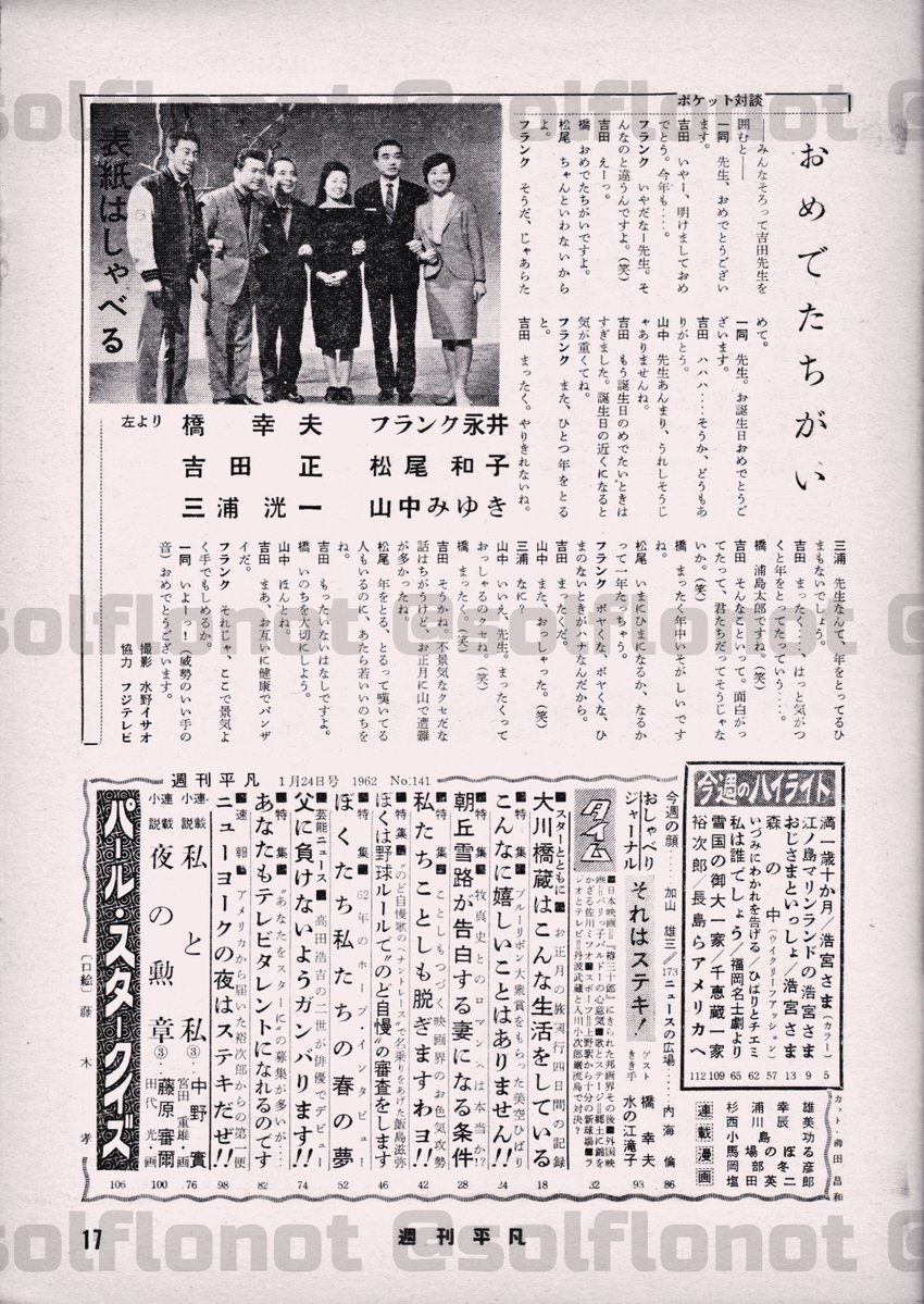 #週刊平凡 1962年1月24日号 表紙に惹かれて思わず購入。 #吉田正 さんを囲んで当時の門下生が集合。一番若いのが、#橋幸夫 君という感じが時代を感じて良いですね。 ほとんどの方が鬼籍に入られてしまい、時の流れというのをつくづく感じます。 #フランク永井 #松尾和子 #三浦洸一 #山中みゆき pic.x.com/zvw3cX4yHx x.com/solflonot/stat…