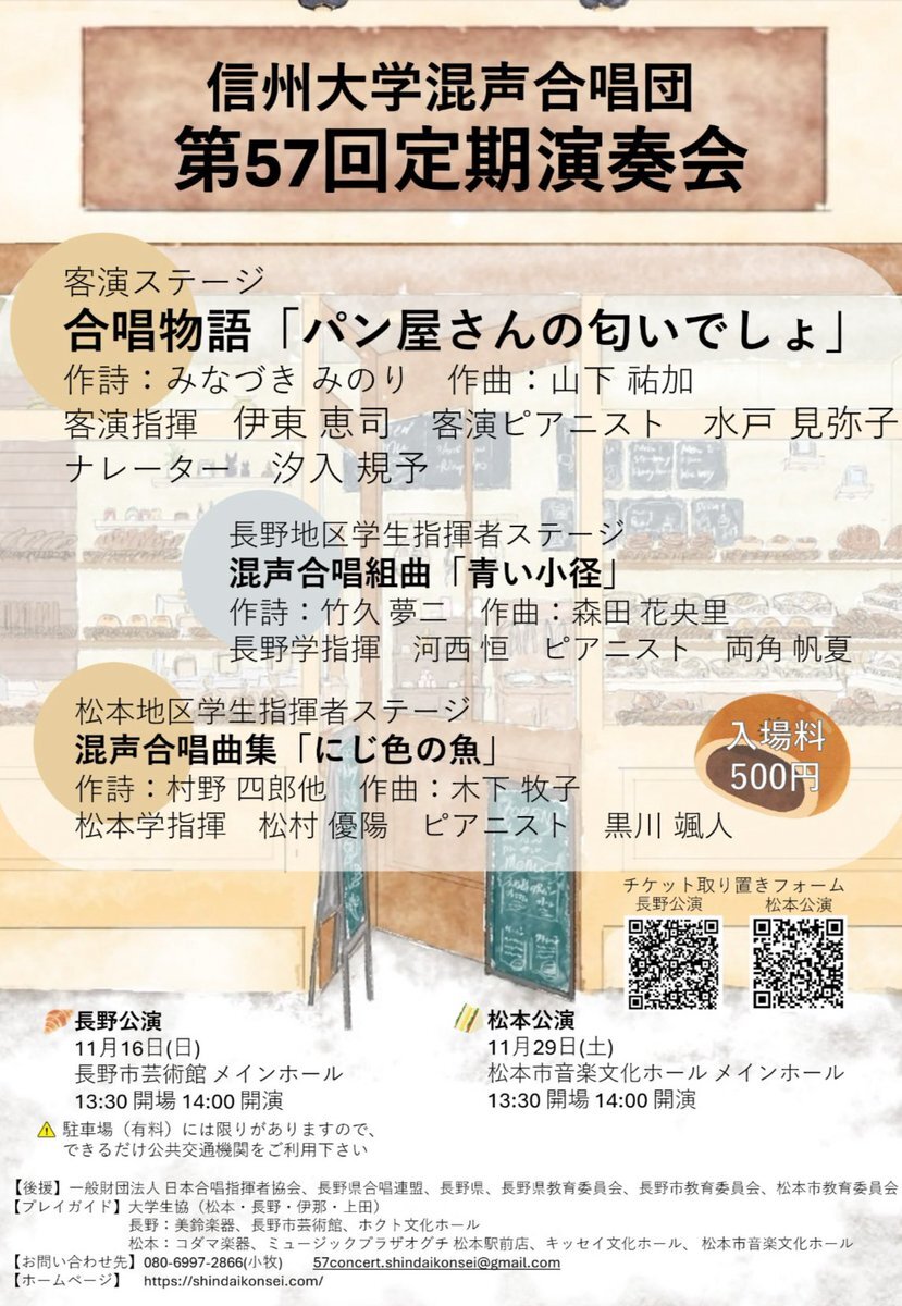 返信先:@shindai_konsei#松本 帰省した11/29信州大学混声合唱団第57回定演 #信大混声57 聴きにザ・ハーモニーホール@the_harmonyhall 合唱物語「パン屋さんの匂いでしょ」 曲:#山下祐加 詩:みなづきみのり 客演指揮:#伊東恵司 客演Pf:#水戸見弥子 とても美味しい・楽しい楽曲で,パン食べたくなる お勧め🍞紹介して〜🤗 pic.x.com/62oZnWZTk7