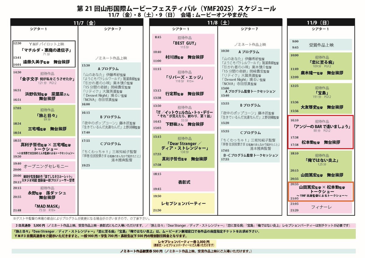 私が監督を務めた「#アンジーのBARで逢いましょう」が『#山形国際ムービーフェスティバル』で上映されます!👍 私もお招きを頂き錚々たる顔ぶれの監督の方々に交わらせてもらいポスターでも末席に加わらせて頂きました😁 「#俺ではない炎上」#山田篤宏 監督とトークショーもあります!🙋♂️ #松本動 #YMF pic.x.com/sXChLfhxlW