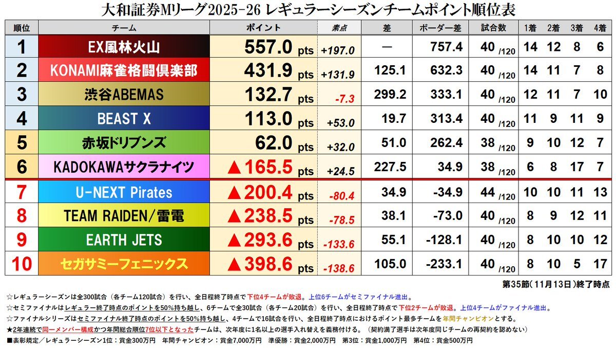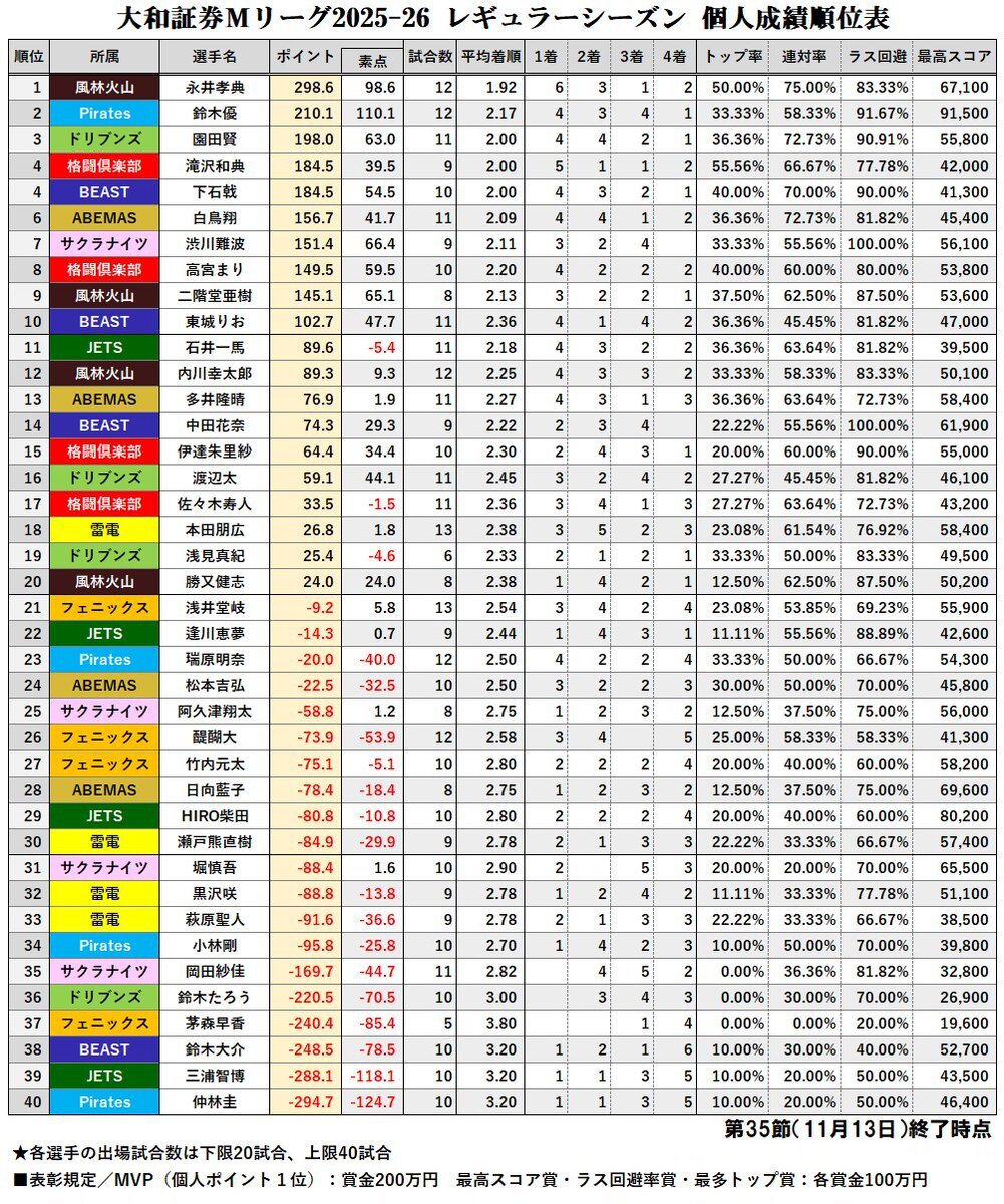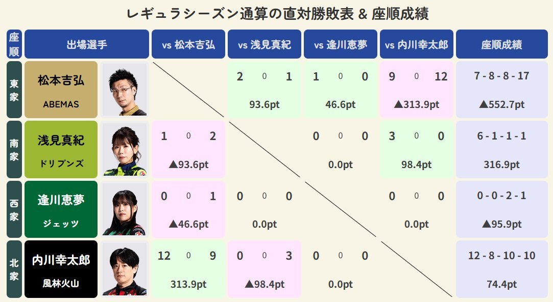 Мリーグ2025-26 レギュラーシーズン 11/14(金) 第1試合 レギュラーシーズン通算直対成績・座順成績 #Мリーグ #松本吉弘 #浅見真紀 #逢川恵夢 #内川幸太郎 pic.x.com/7712lXFeF8 x.com/m_league_/stat…