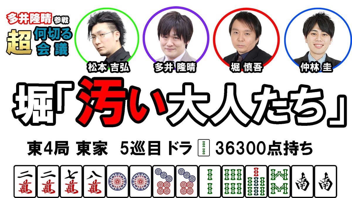 皆様からの何切るに、 RMU代表 #多井隆晴 日本プロ麻雀協会 #松本吉弘 #堀慎吾 #渋川難波 がお答えする「多井隆晴参戦!何切る超会議」第42回公開しました! 見切るのは七対子?ドラ? ✅youtube.com/watch?v=KJyboL… 前回⏰ youtube.com/watch?v=ejL4dt… pic.x.com/6fIdrFZXdd