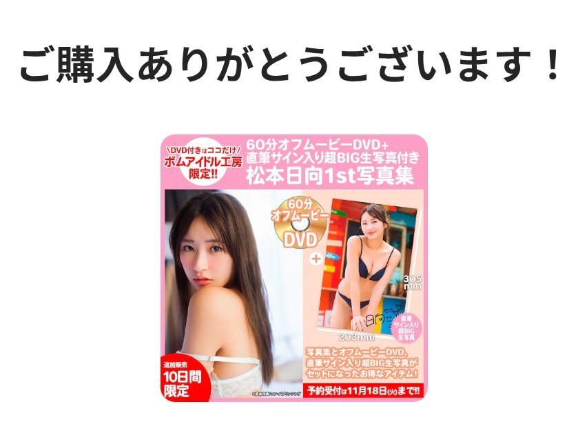 / 📢追加販売決定!11/8(土)~18(火)の10日間限定! \ 撮影オフムービーDVD& 直筆サイン入り超BIG生写真付き #松本日向 1st写真集 今すぐチェック▶bombidol.official.ec/items/121867953 #松本日向 #松本日向1st写真集 x.com/idol_bomb/stat…