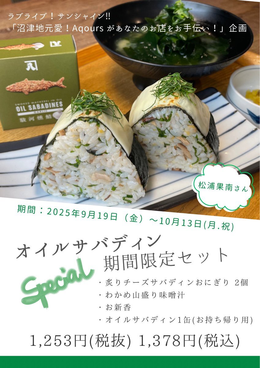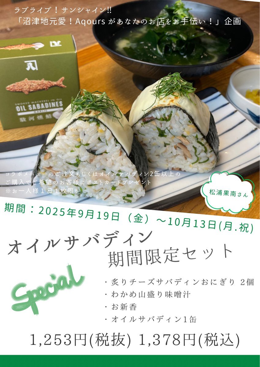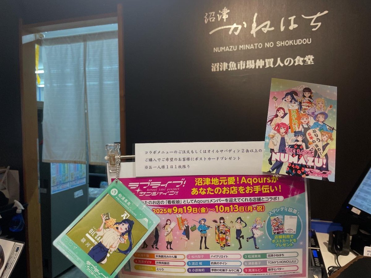 #沼津かねはち 「沼津地元愛!Aqours が あなたのお店をお手伝い!」企画 本日10/13(月.祝)まで。 コラボメニューのご注文or オイルサバディン2缶以上のご購入で ラブライブポストカードプレゼントも 今日まで! #ラブライブサンシャイン #Aqours #松浦果南 #沼津看板娘 #沼津港 pic.x.com/i8AuErYgCv