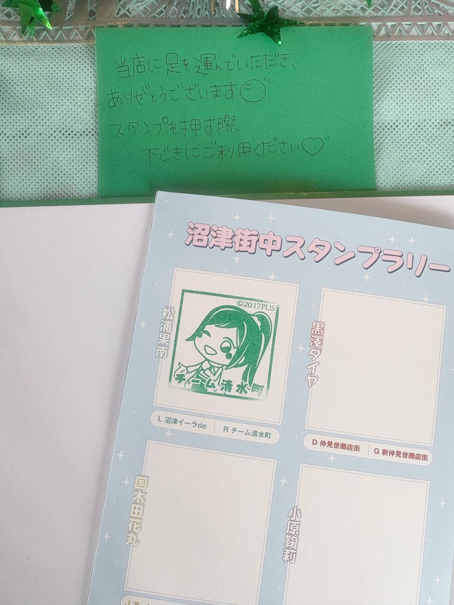#沼津街中へいこうよ2025 始まりましたね(´,,•﹏•,,`)❤︎ 当店のスタンプゾーンはこんな感じです🐬♡ インク乾燥防止の為、 蓋閉めにご協力ください(´× ̫ ×`)՞ ՞ クイズはこのスタンプゾーンの上の壁、 右横の壁2ヶ所に掲示しています💚 #松浦果南 pic.x.com/FrIoLhWztZ