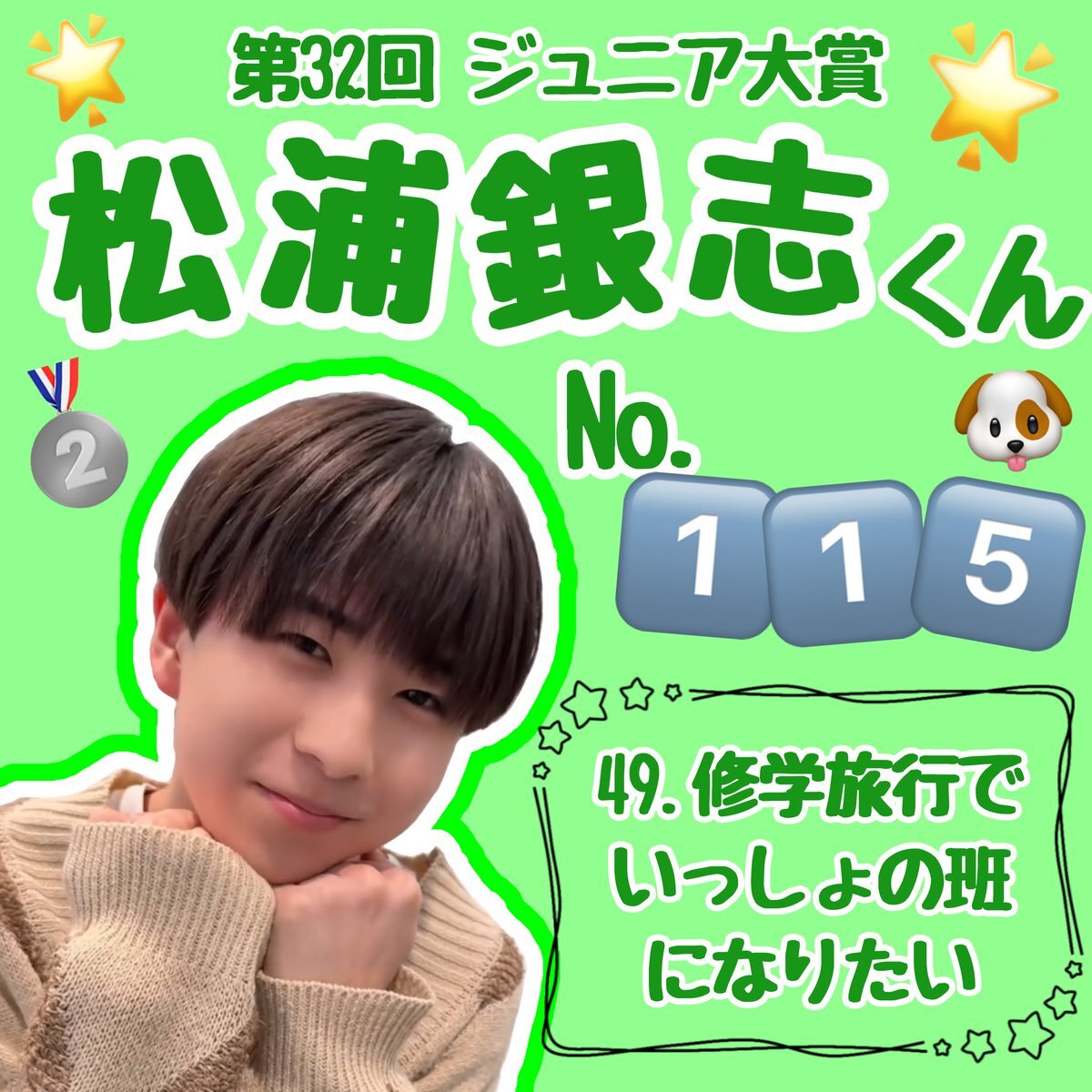 【第32回 ジュニア大賞】 #ジュニア大賞うちの子どうですか \ No.1️⃣1️⃣5⃣ 松浦銀志くん 🥈💚/ 49.修学旅行でいっしょの班になりたい 高校生以下部門ラストチャンスなので今年こそは1位をプレゼントしたいです> < #松浦銀志 #ジュニア大賞 #Jr大賞