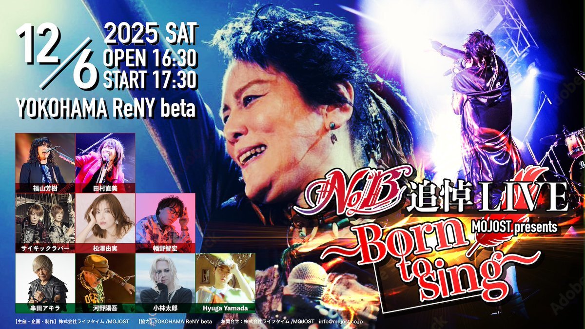 【#NoB 】 ⏬🎟️チケット受付開始🎟️⏬ passmarket.yahoo.co.jp/event/show/det… 『NoB追悼Live Mojost presents ~Born to sing~』 【出演】#福山芳樹/#田村直美/#サイキックラバー/#松澤由実/#幡野智宏 〈特別出演〉#串田アキラ/#河野陽吾/#小林太郎/ Hyuga Yamada 📅2025年12月6日(土) 📍YOKOHAMA ReNY beta