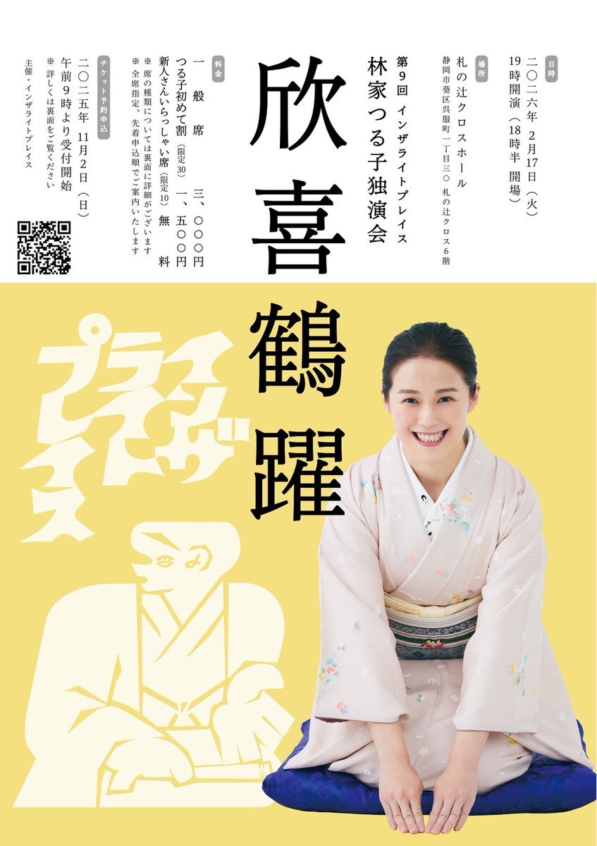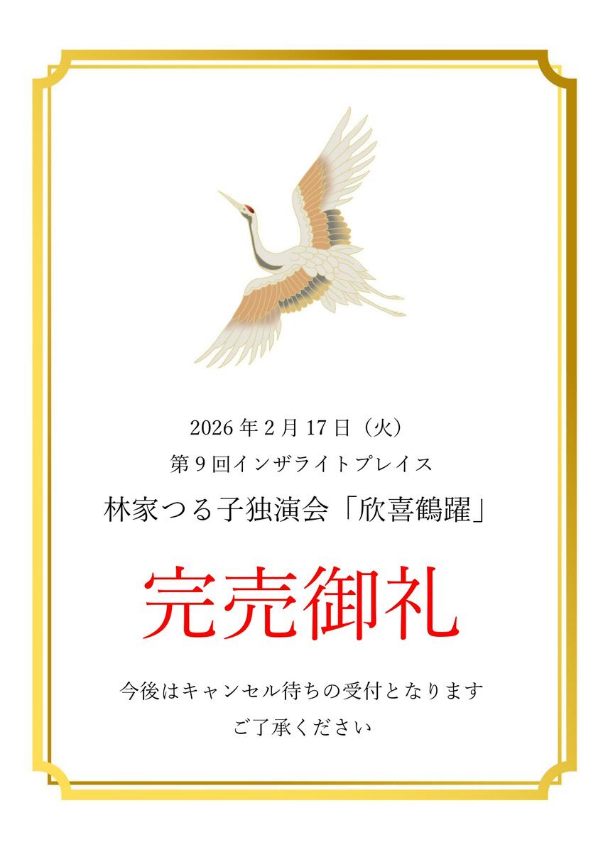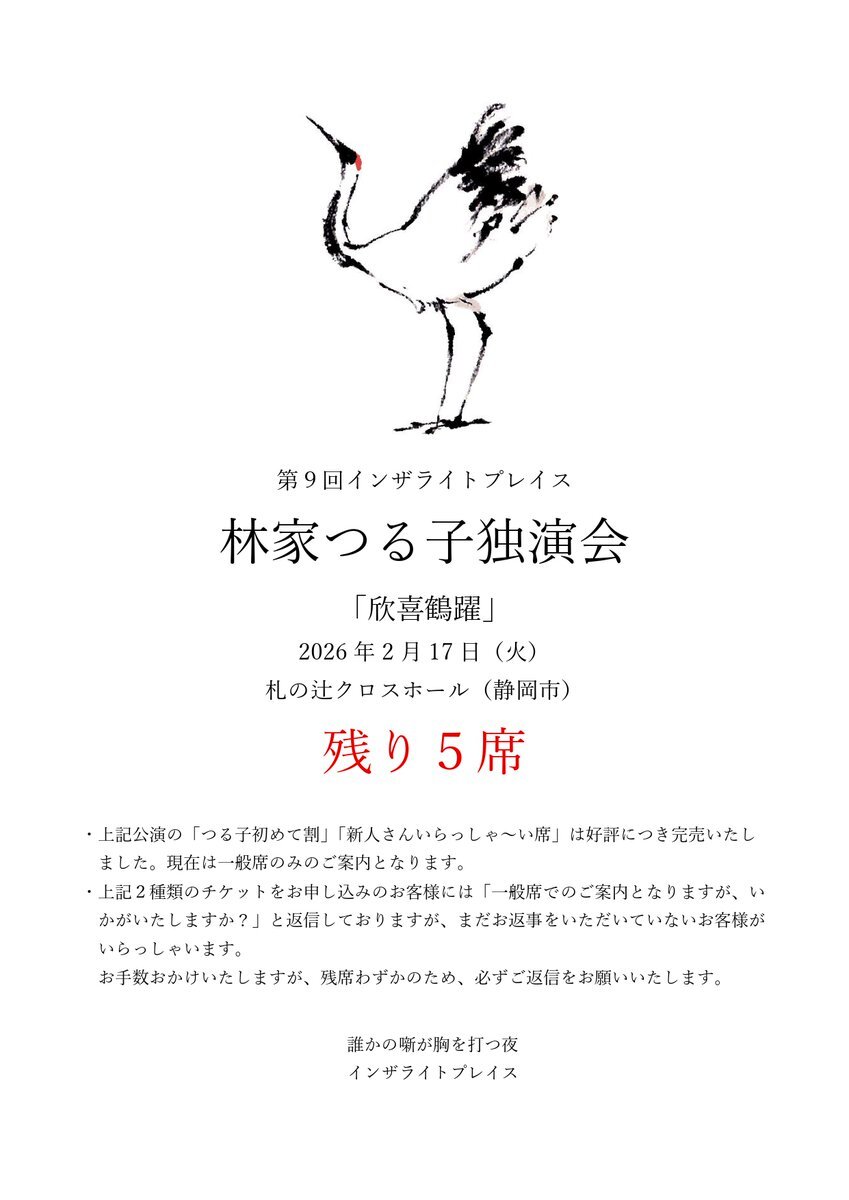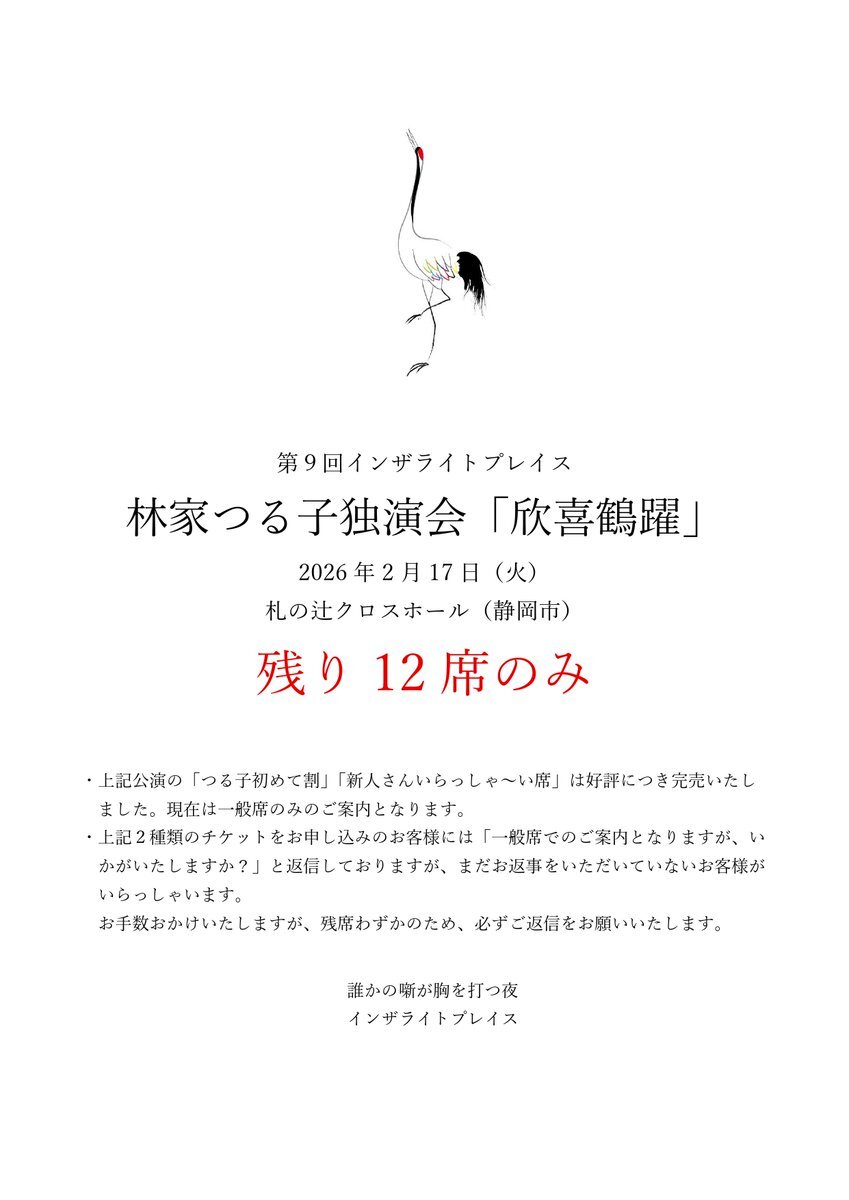 【お願い】 2026年2月17日(火) 第9回インザライトプレイス 林家つる子独演会「欣喜鶴躍」 札の辻クロスホール(静岡市) 好評につき、残り一般席12席のみ。 お申し込みの際は注意事項をお読みください。 よろしくお願いします。 詳細 instagram.com/p/DPv7nrtAerJ/ #林家つる子 #落語 #静岡市 #独演会 pic.x.com/okoIxgNU9U