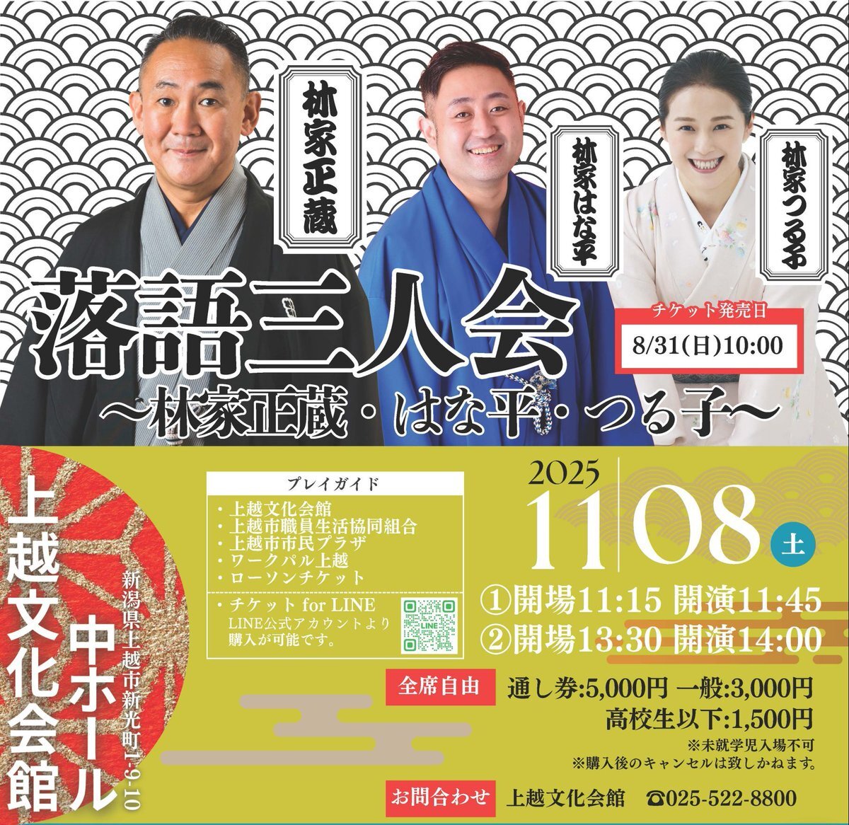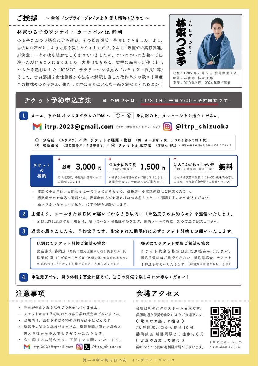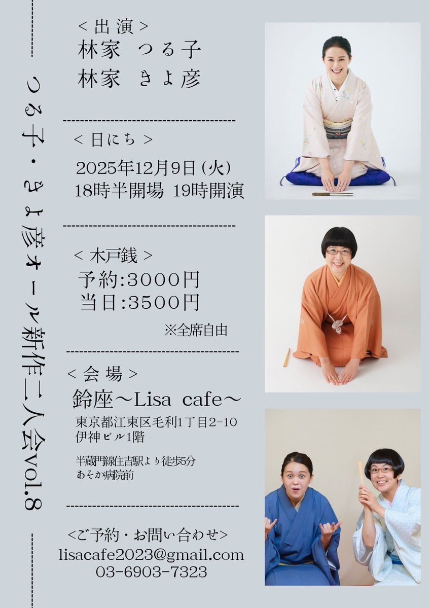 【お願い】 2026年2月17日(火) 第9回インザライトプレイス 林家つる子独演会「欣喜鶴躍」 札の辻クロスホール(静岡市) 好評につき、残り一般席12席のみ。 お申し込みの際は注意事項をお読みください。 よろしくお願いします。 詳細 instagram.com/p/DPv7nrtAerJ/ #林家つる子 #落語 #静岡市 #独演会 pic.x.com/okoIxgNU9U