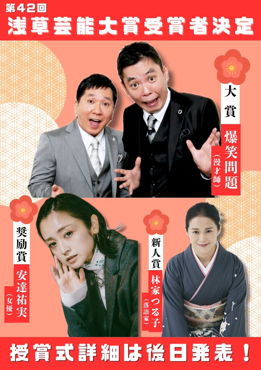 台東くん! 浅草の大衆芸能を盛り上げる #浅草芸能大賞 の第42回受賞者が決定したパゴッ🎉✨ 大賞は #爆笑問題 さん、奨励賞は #安達祐実 さん、新人賞は #林家つる子 さんパゴッ! 授賞式の観覧応募の詳細は12月20日頃に発表されるからチェックするパゴ~ッ! #浅草 taitogeibun.net/our_events/zai… pic.x.com/ZIqtMMASIF