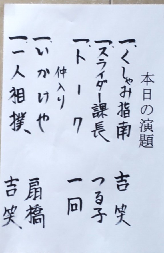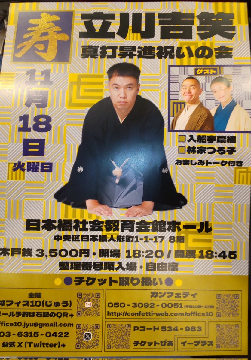 11月18日(火)、立川吉笑 真打昇進祝いの会@日本橋社会教育会館 「くしゃみ指南」#立川吉笑 「スライダー課長」#林家つる子 トーク ~仲入り~ 「いかけや」#入船亭扇橋 「一人相撲」立川吉笑 前日と同じ会場ですが、中身は打って変わって新作メインの会に🙂 今年6月に真打昇進したばかりの吉笑師匠を pic.x.com/24l5dxHZ6G