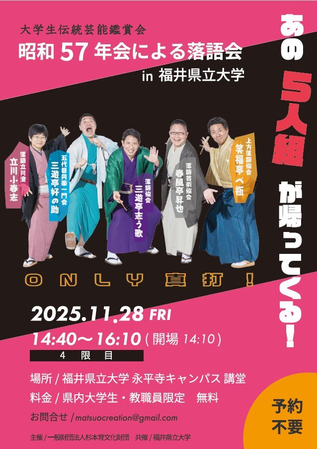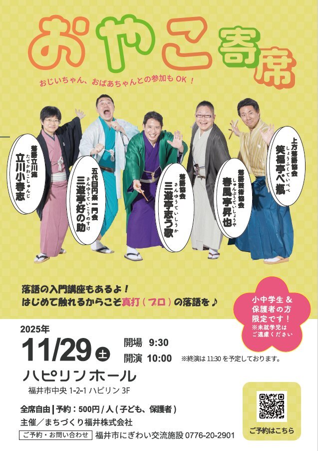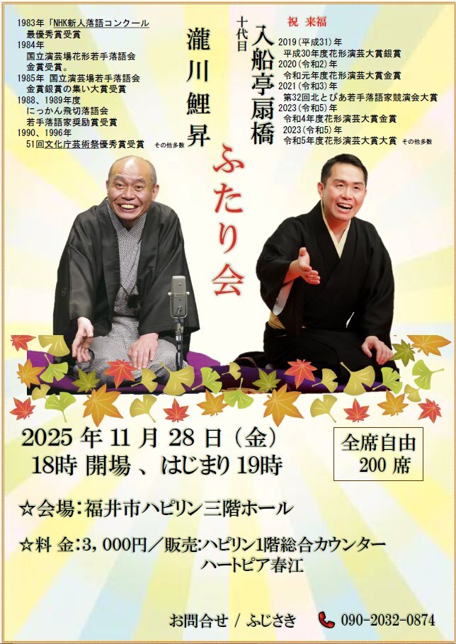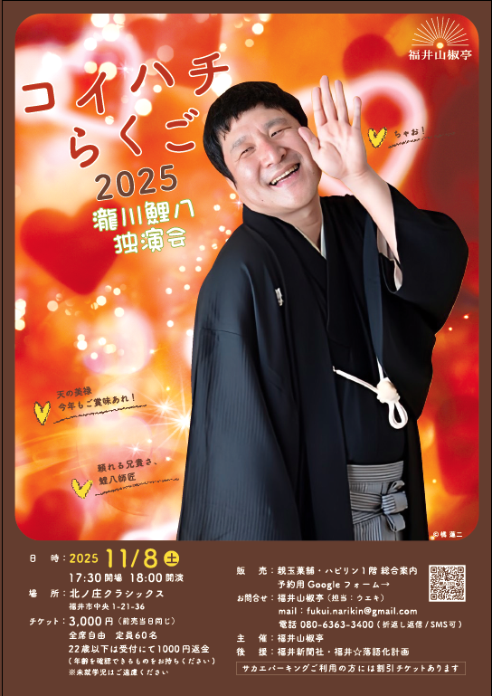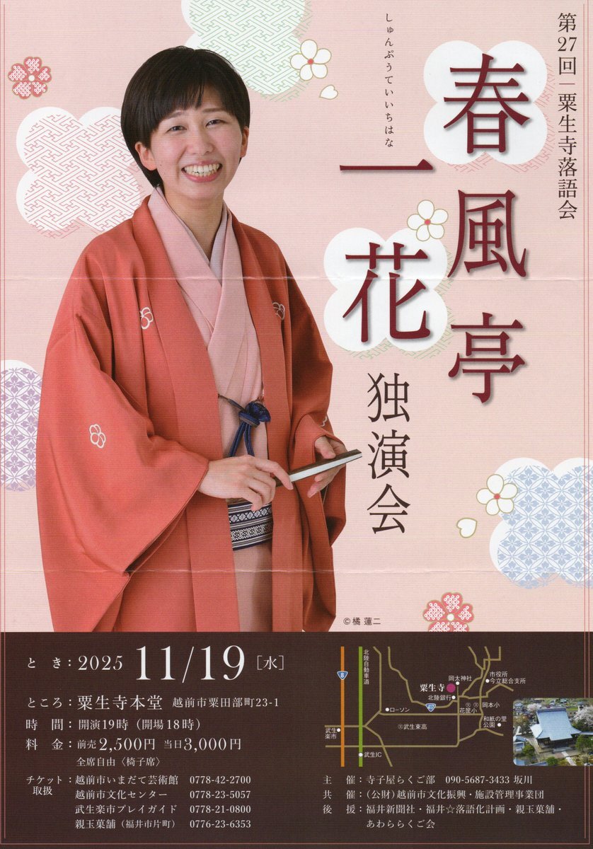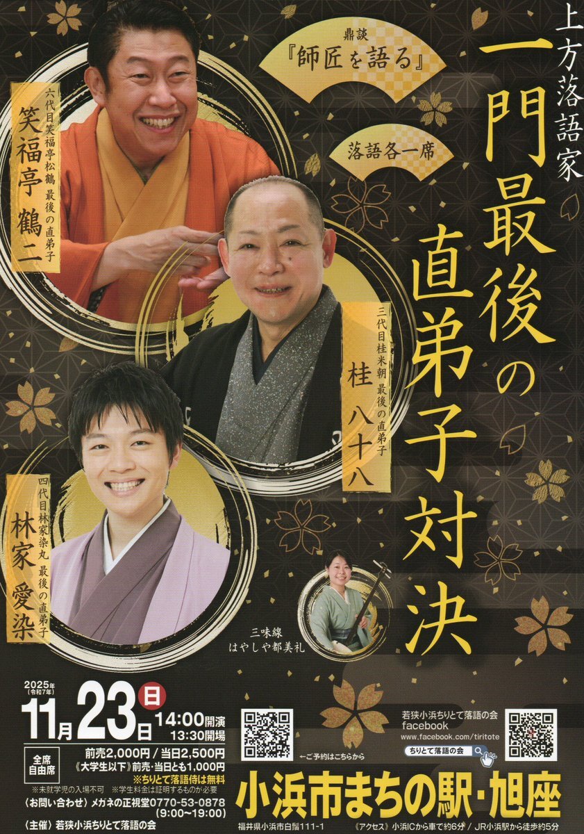 【日曜日!】 上方落語家 一門最後の直弟子対決 出演 #笑福亭鶴二 #桂八十八 #林家愛染 #小浜市まちの駅・旭座 福井県小浜市白鬚111-1 11/23(日)14:00開演 前売2,000円 / 当日2,500円 ≪大学生以下≫1,000円 ※要年齢証明の証 ※未就学児不可 〈問合せ〉 メガネの正視堂0770-53-0878(9時~19時) pic.x.com/fV1XgJxsJR