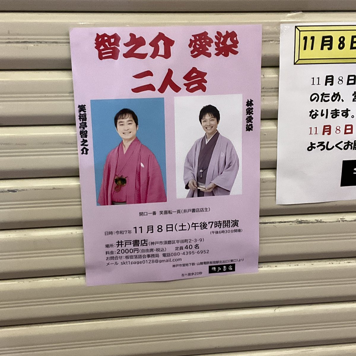 2025年11月8日の記録 智之介・愛染二人会(井戸書店) 笑喜亭一頁(アマチュア) いらち俥 #笑福亭智之介 アフリカ探検(仁智作) #林家愛染 悋気の独楽 〜仲入〜 林家愛染 地下鉄 笑福亭智之介 子は鎹 pic.x.com/wSe1cQWVUq