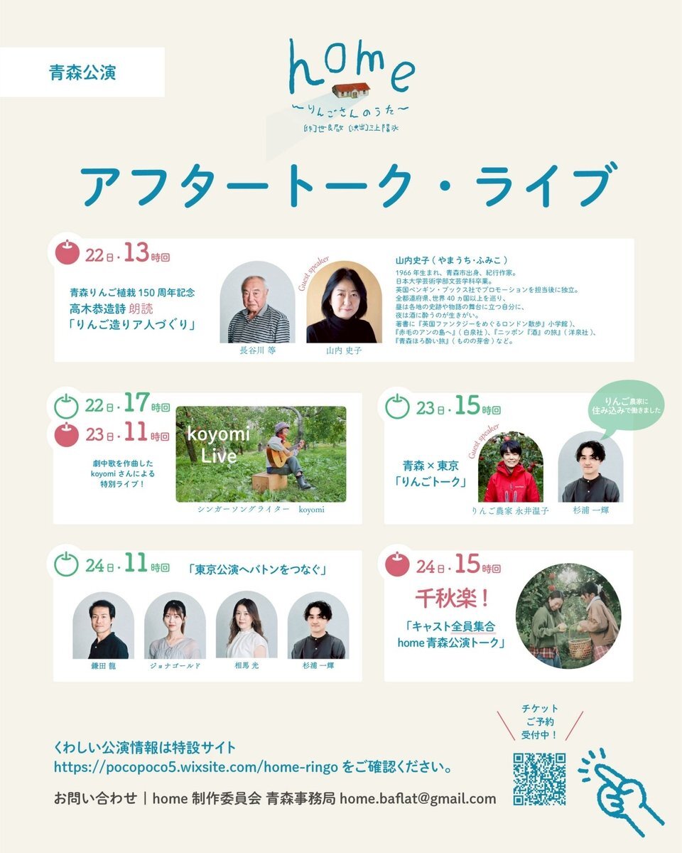 /  アフタートーク•ライブ公開! \ なんと!#home青森 公演は 全ての回に豪華なアフタートーク、ライブがあります!お楽しみに🍎🍏 『home』~りんごさんのうた~ 11月22日(土)~24日(月祝) 青森県立美術館 シアター お問い合わせ ✉️ lit.link/homeproject ご予約 forms.gle/z5XgC7qFQs6ty6…