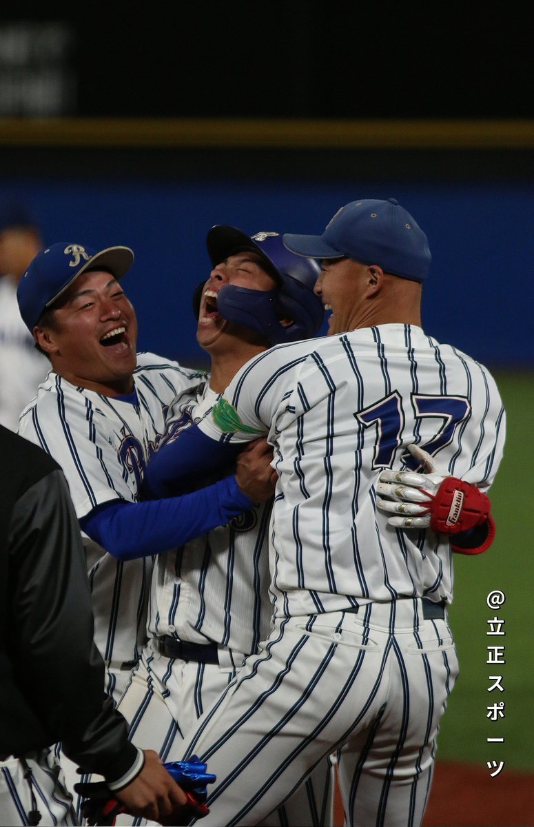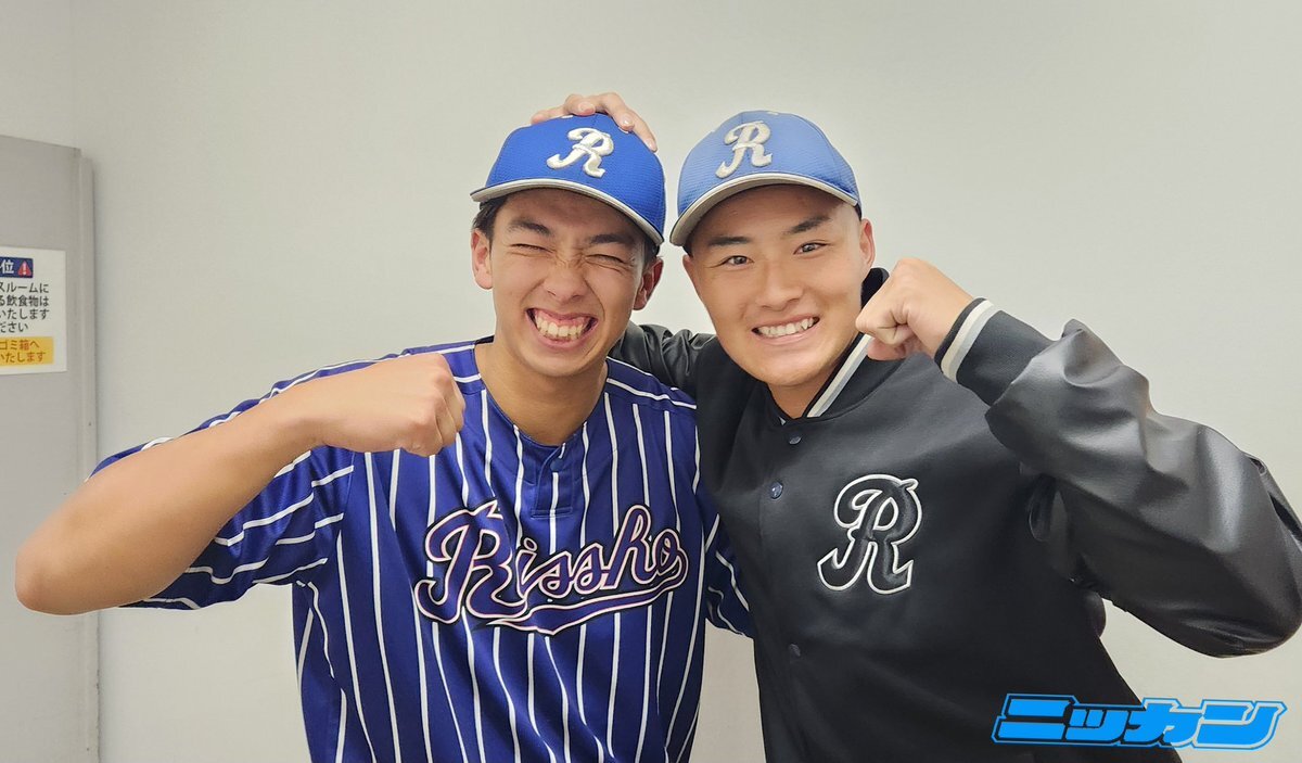 #東都大学野球入れ替え戦 先勝した #立正大 (左から)サヨナラ打の #椎木卿五 選手(1年=#横浜)と #林燦 投手(4年=広陵)。椎木君のこの表情から、そのうれしさが伝わってくる~~~😆👍 pic.x.com/MHEr1O3e8h