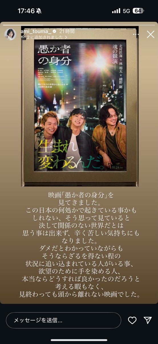 #愚か者の身分 俳優の #當真あみ さん が観てくれて感想をインスタグラムに上げてくれました! 新宿で観てくれたそうです!