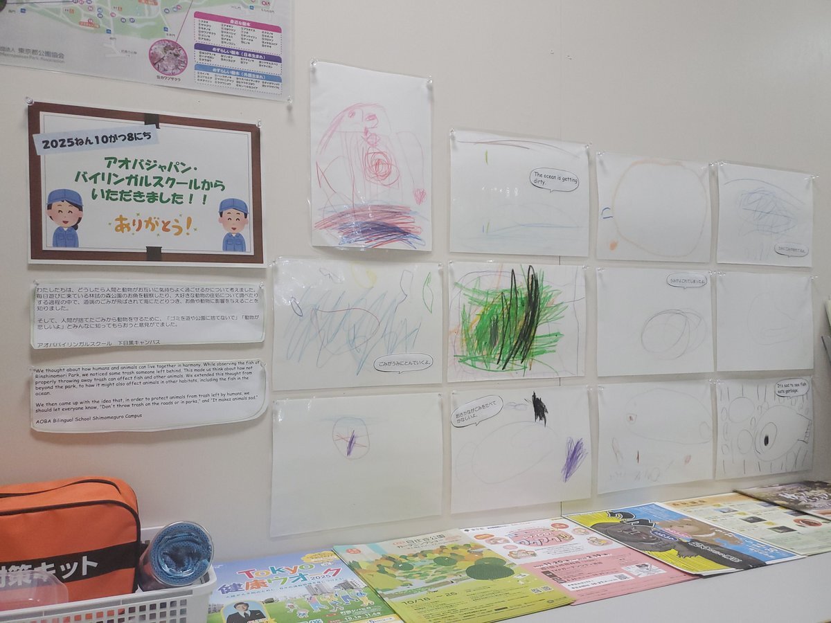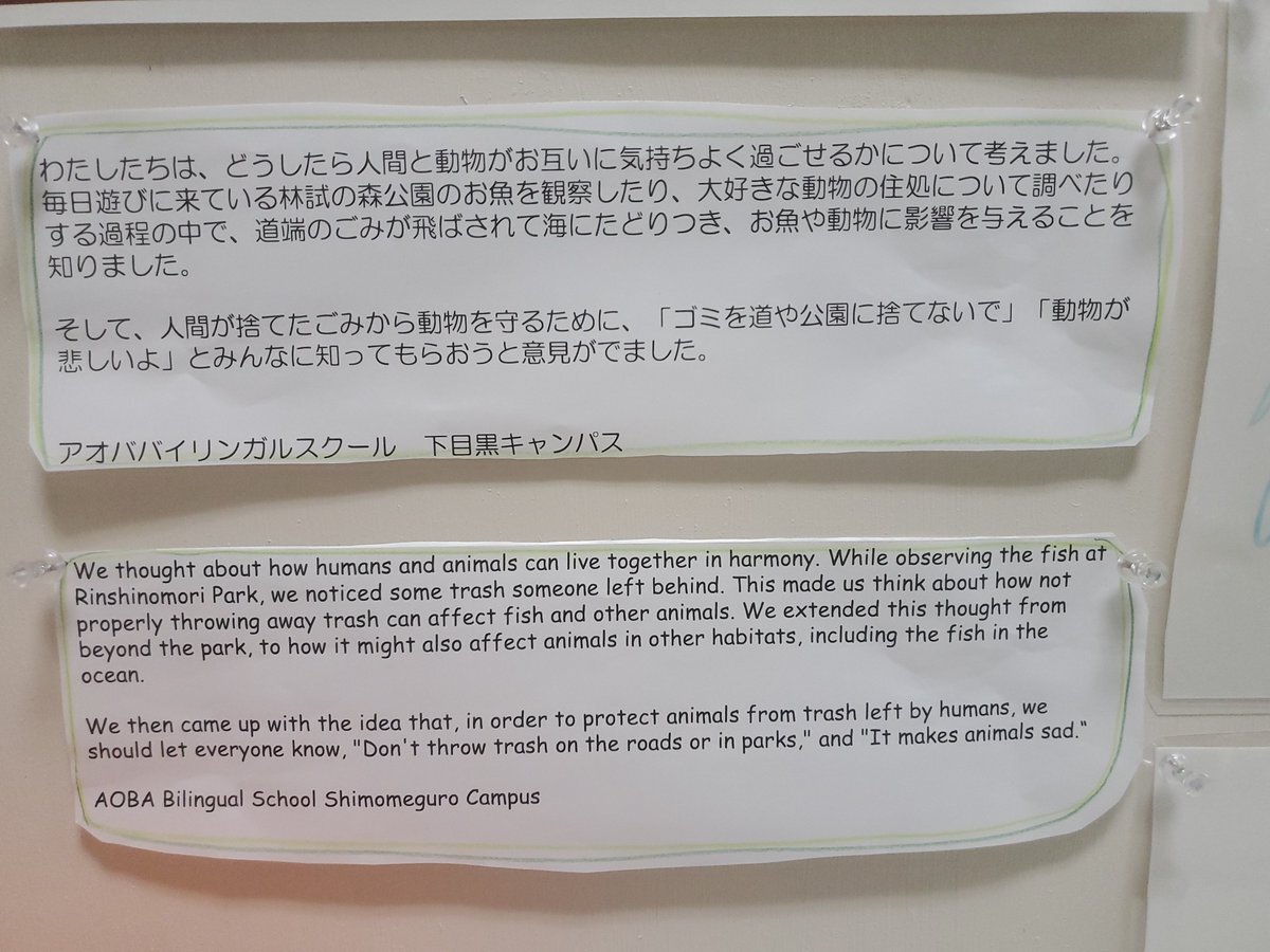 アオババイリンガルスクール下目黒キャンパスのお友達から、素敵なメッセージと絵をいただきました✨ みんなと大好きな動物やお魚が気持ちよく過ごすために、ゴミを公園や道路に捨てないでという思いが込められています😌 今日は来てくれてありがとう! また遊びに来てね! #林試の森公園 pic.x.com/fM9QmZGM6A